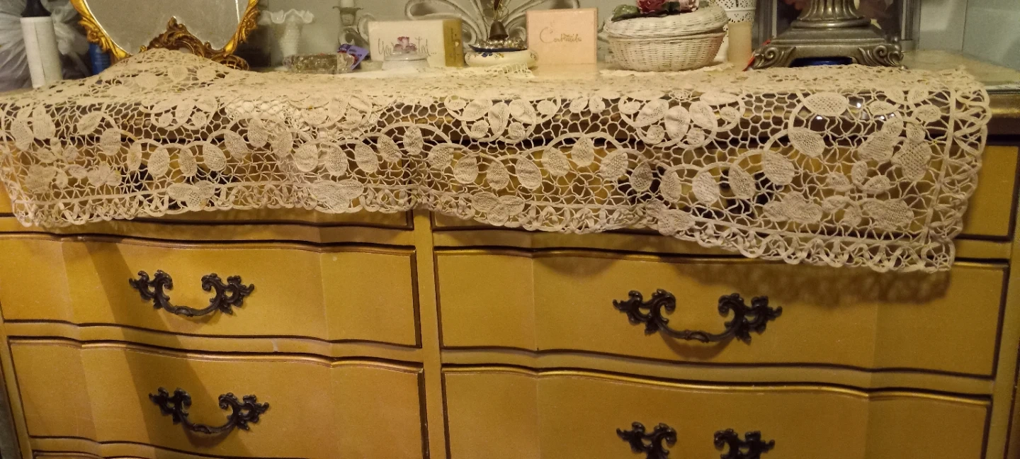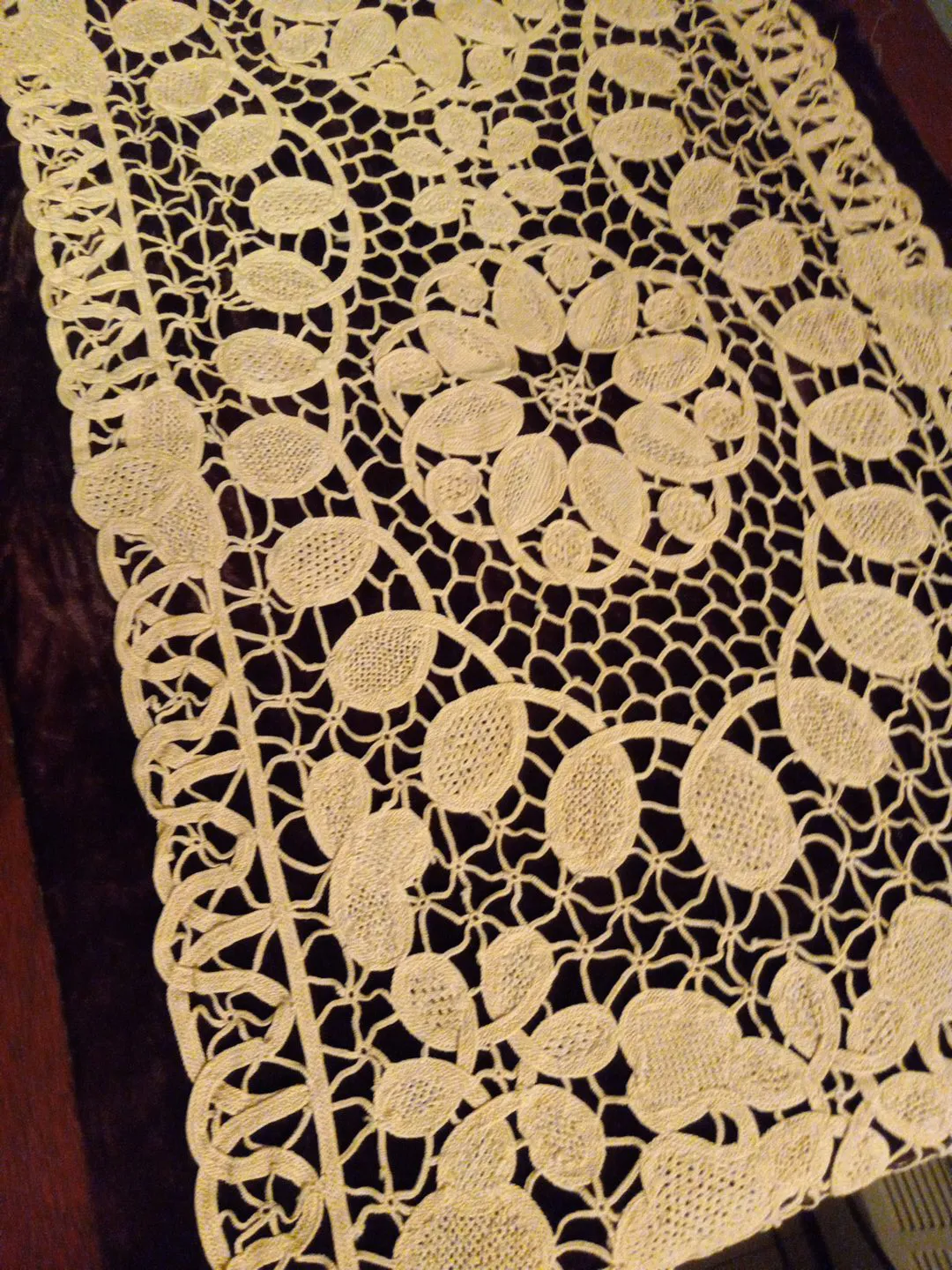 Decorative lace table runner with an intricate floral and leaf pattern. It's ivory in colour and measures approximately 46inches long. This piece is $12.