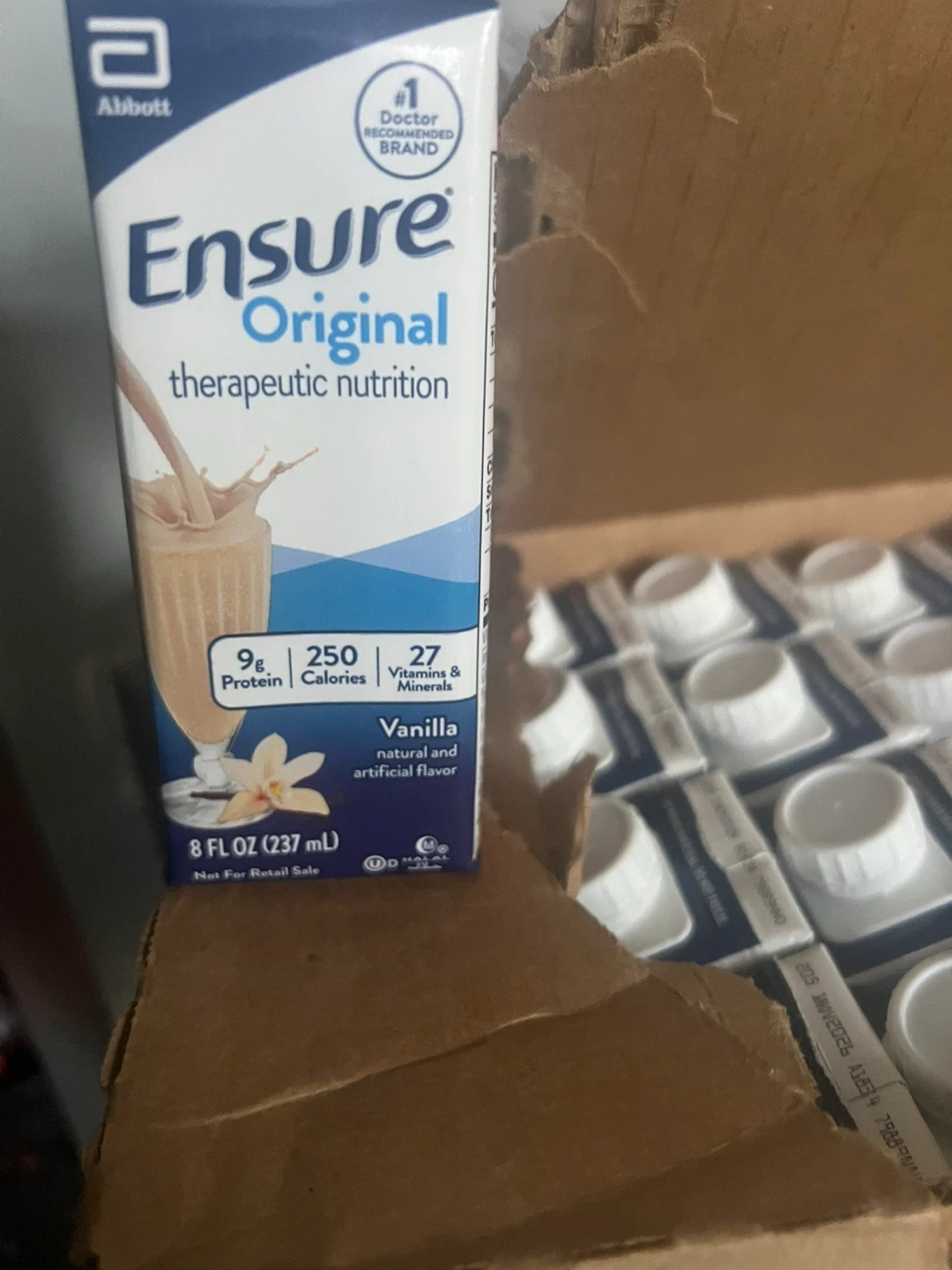 Ensure Original therapeutic nutrition drink in vanilla flavor. Each 8 fl oz (237 mL) bottle contains 9g protein, 250 calories, and 27 vitamins & minerals. It's a doctor-recommended brand.
