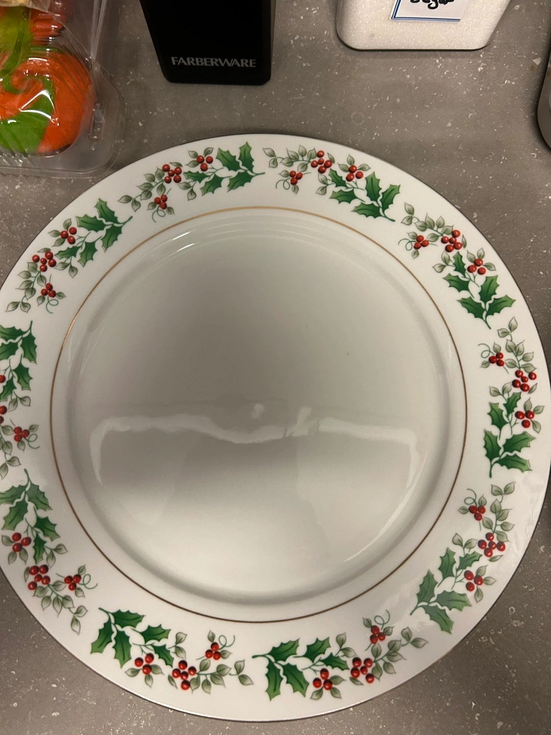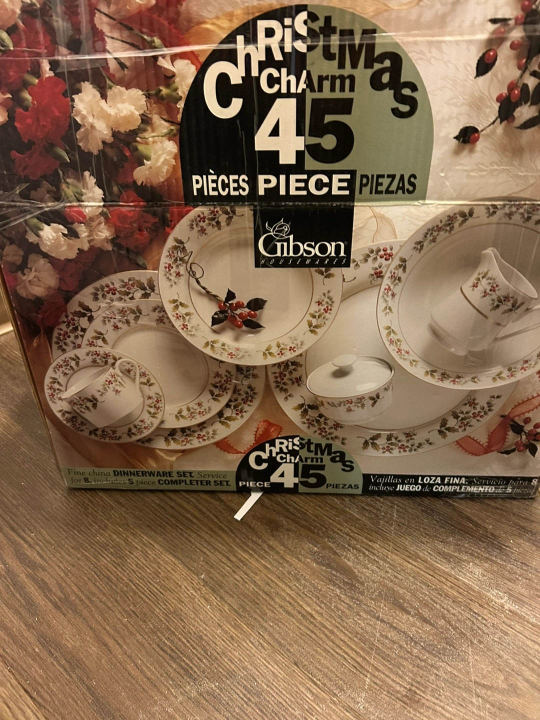 Fine china dinnerware set. Christmas theme. Holly and berry design. Gold trim. 45 pieces. Excellent condition.