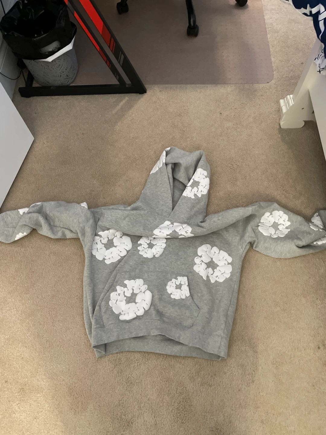 Grey pullover hoodie featuring a repeating pattern of white cloud appliques. It's a comfortable medium size and made from a soft cotton blend. This hoodie's unique design makes it a fun piece for casual wear.