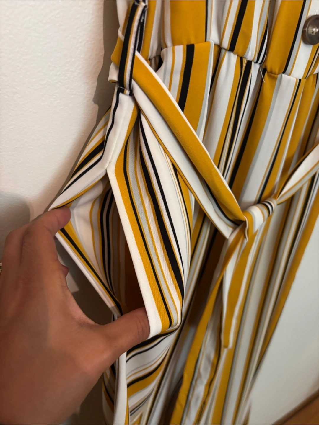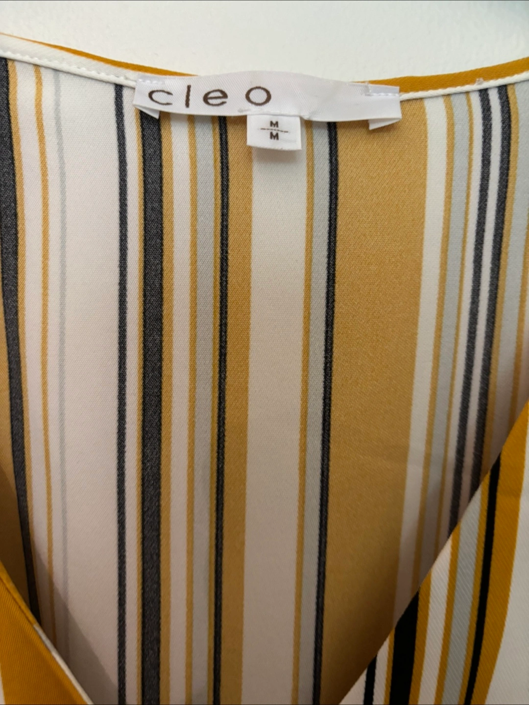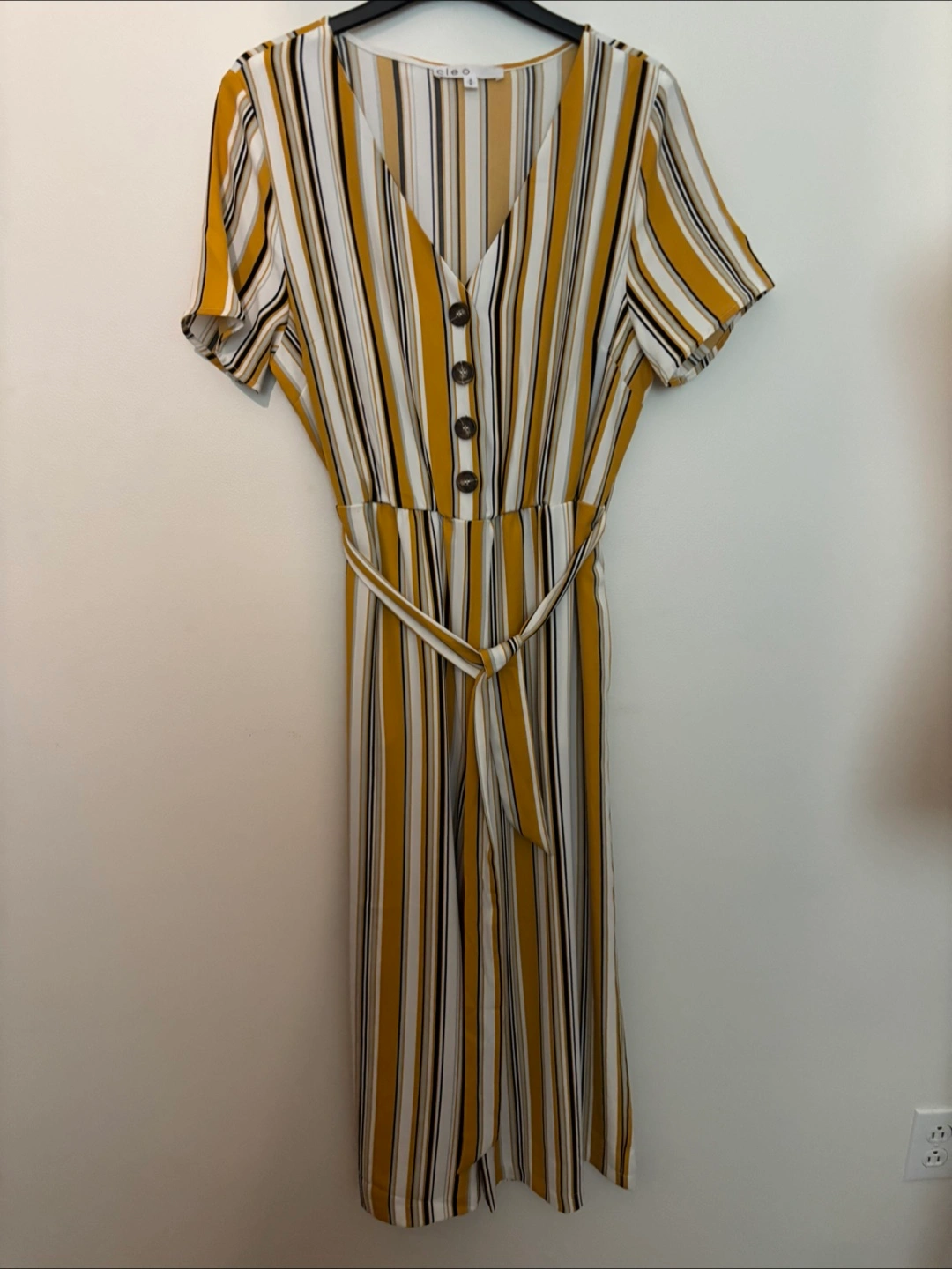 Selling a cute Cleo jumpsuit in size medium! It features a stylish striped pattern with yellow, white, and black colours. Perfect for a casual day out! Mid calf length. Size medium. Cash only.