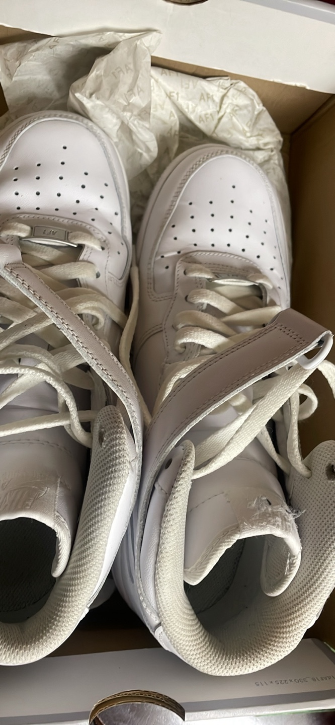 Classic white Nike Air Force 1 High Top sneakers. These kicks are made of leather with a rubber sole. They're ready for everyday wear! Very clean and only worn 2 days. Impeccable condition.