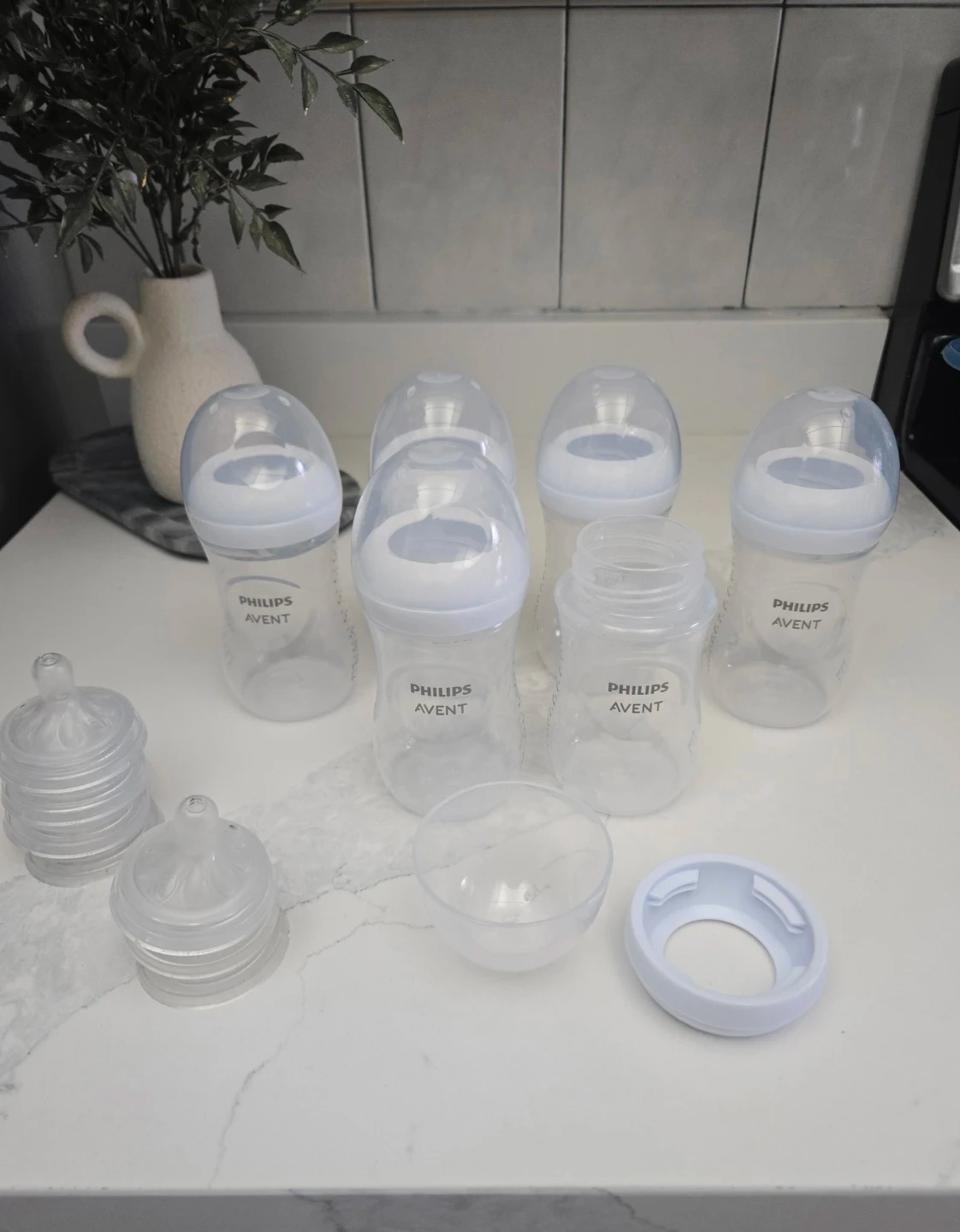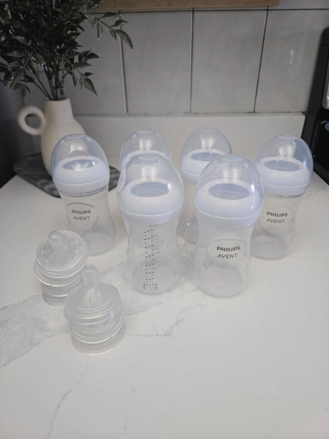 Set of 6 Philips Avent Natural Respnse baby bottles (9 oz). BPA-free plastic construction. Baby controls the pace of feeding, like breast-feeding. No drip & antic-colic.