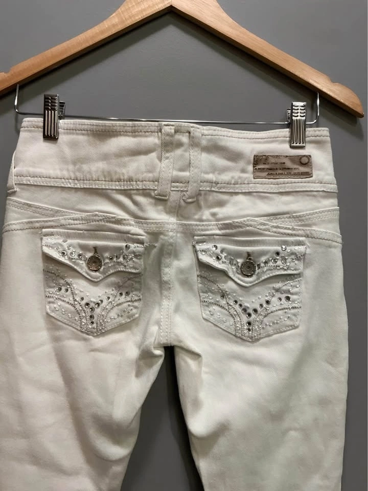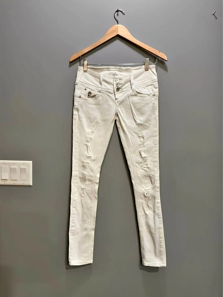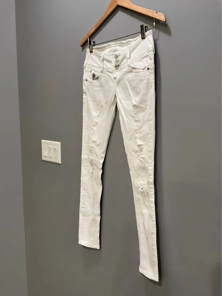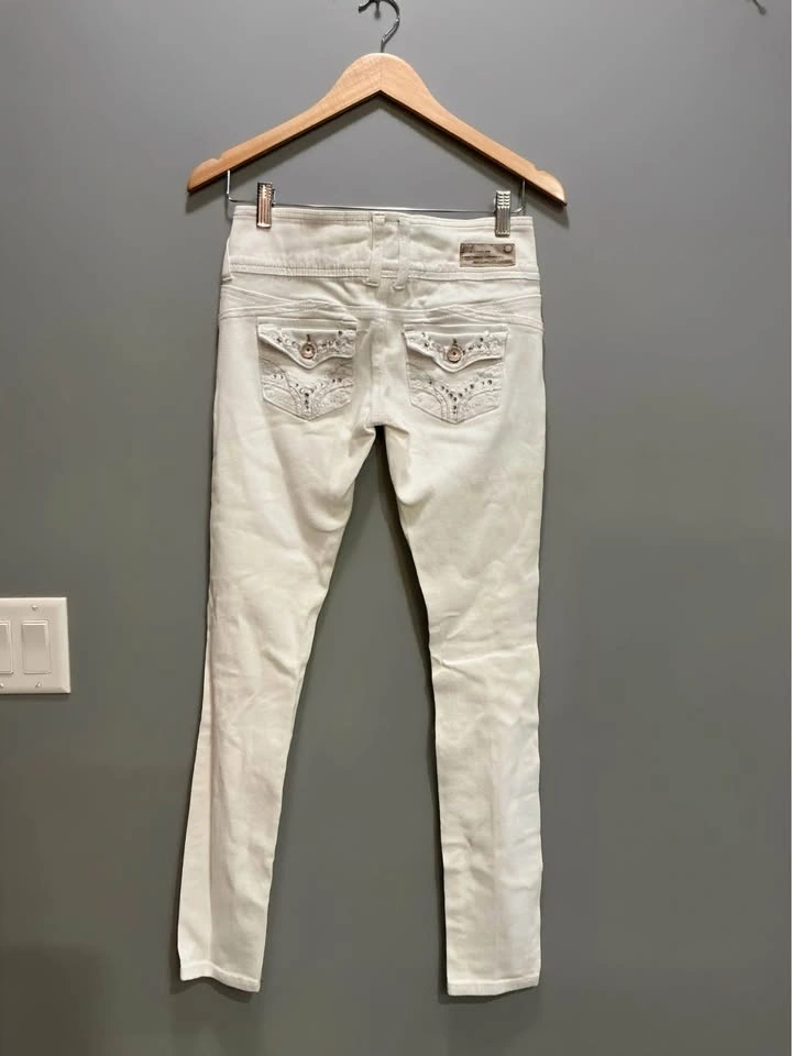 Elevate your denim collection with these statement-making white skinny jeans by Almost Famous. Perfectly blending edgy street style with early 2000s glam, these jeans feature a flattering fit and eye-catching details from every angle. Whether you are styling them for a festival, a night out, or a chic summer look, these jeans are a guaranteed conversation starter.