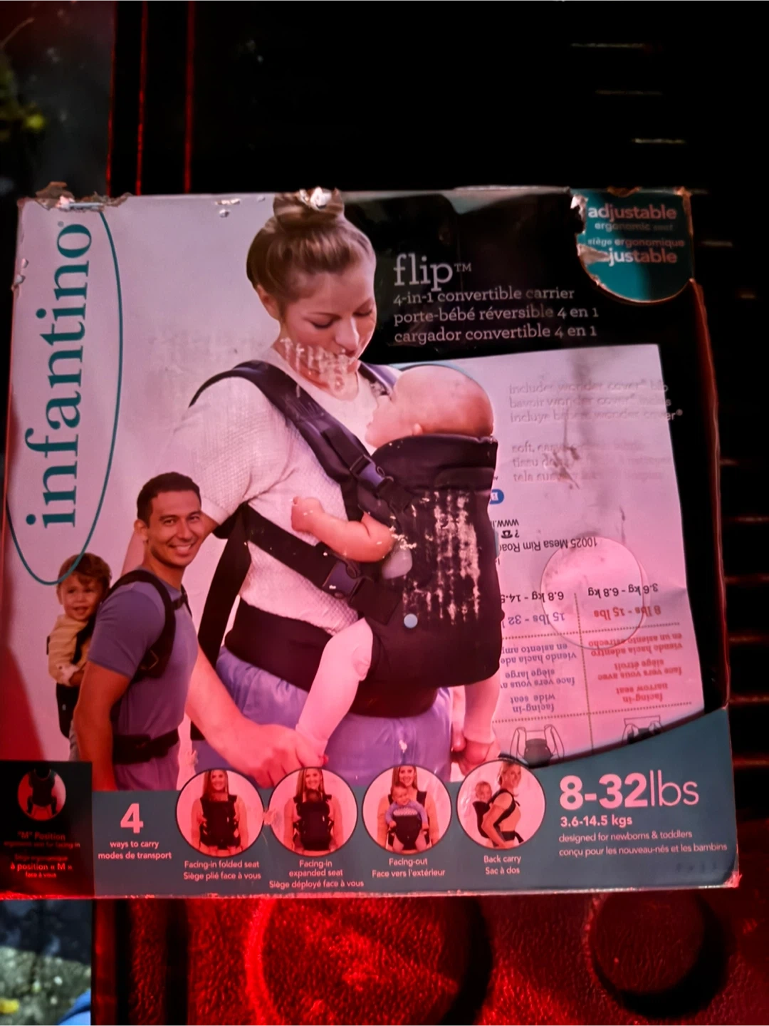 Selling an Infantino Flip 4-in-1 convertible baby carrier! It's designed for newborns and toddlers, supporting weights from 8-32 lbs (3.6-14.5 kgs). You can carry your little one in 4 different ways: facing-in folded seat, facing-in expanded seat, facing-out, and back carry. The box includes a wonder cover too