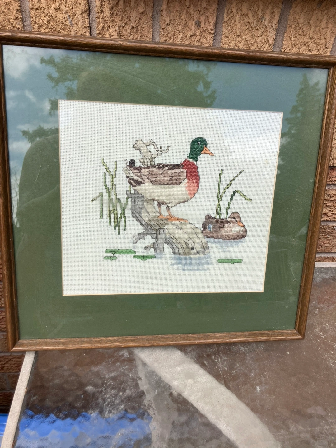 A charming framed needlepoint picture featuring a duck and ducklings in a pond scene.
