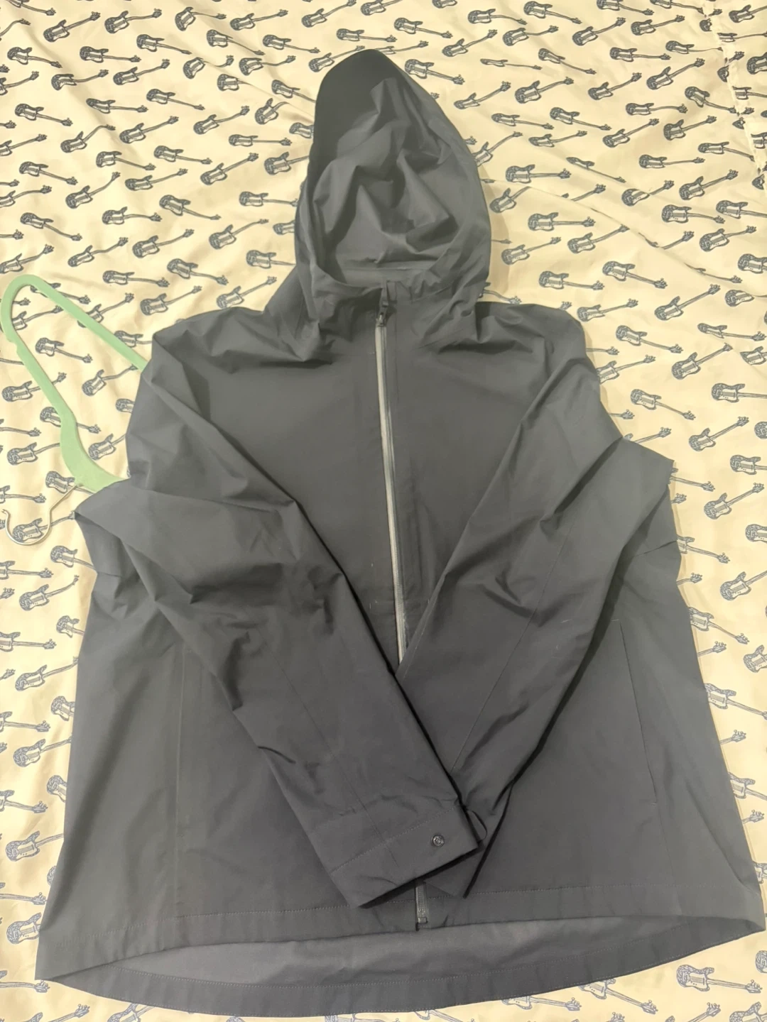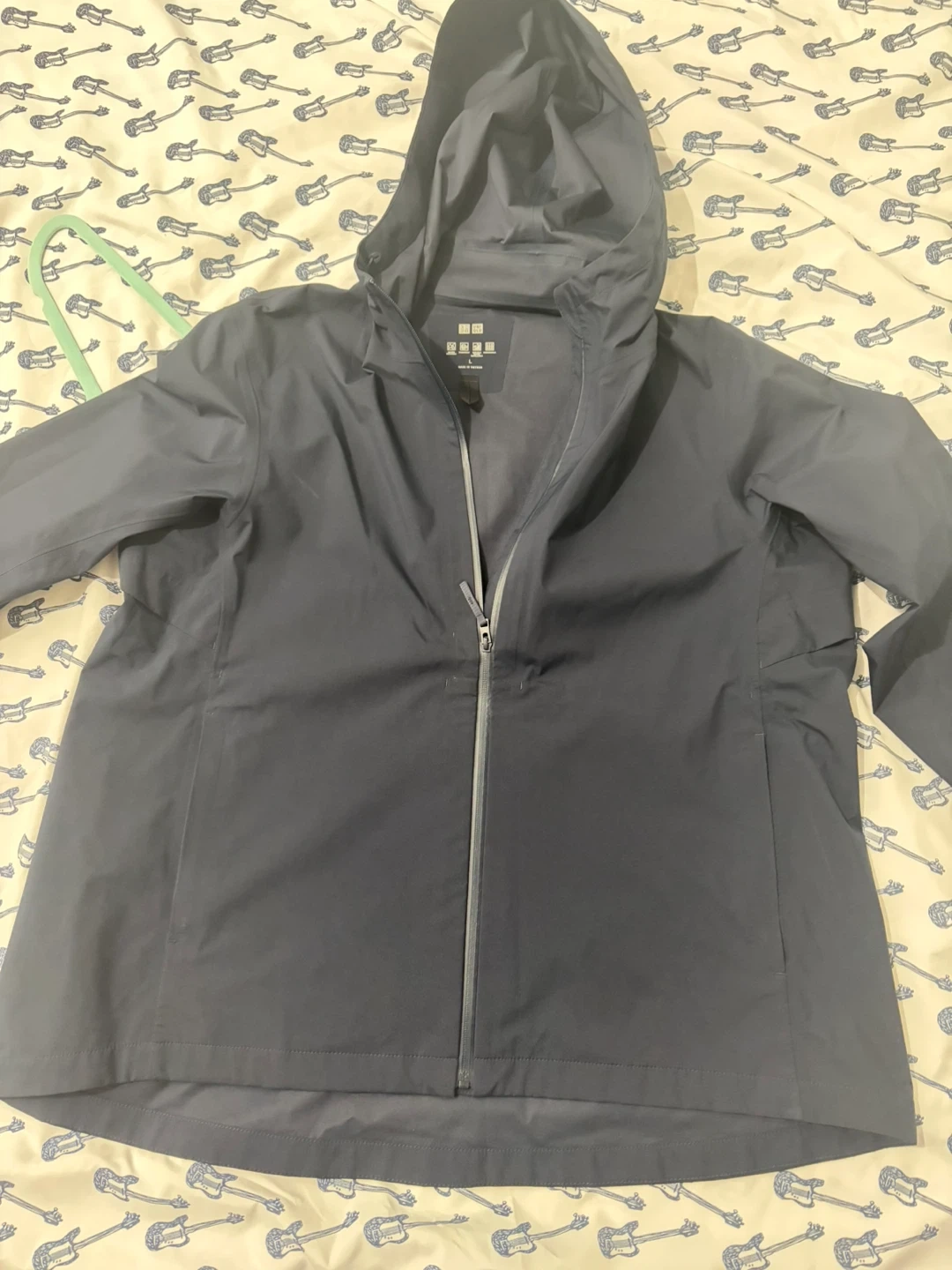 Uniqlo hooded jacket in navy. Lightweight and water-resistant material. Features a full zip front and two side pockets. Great for everyday wear!