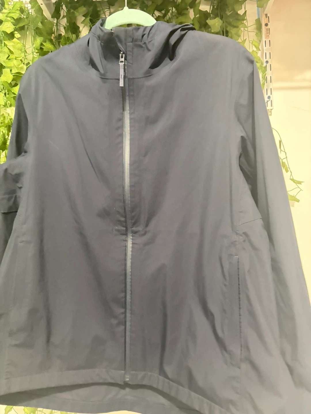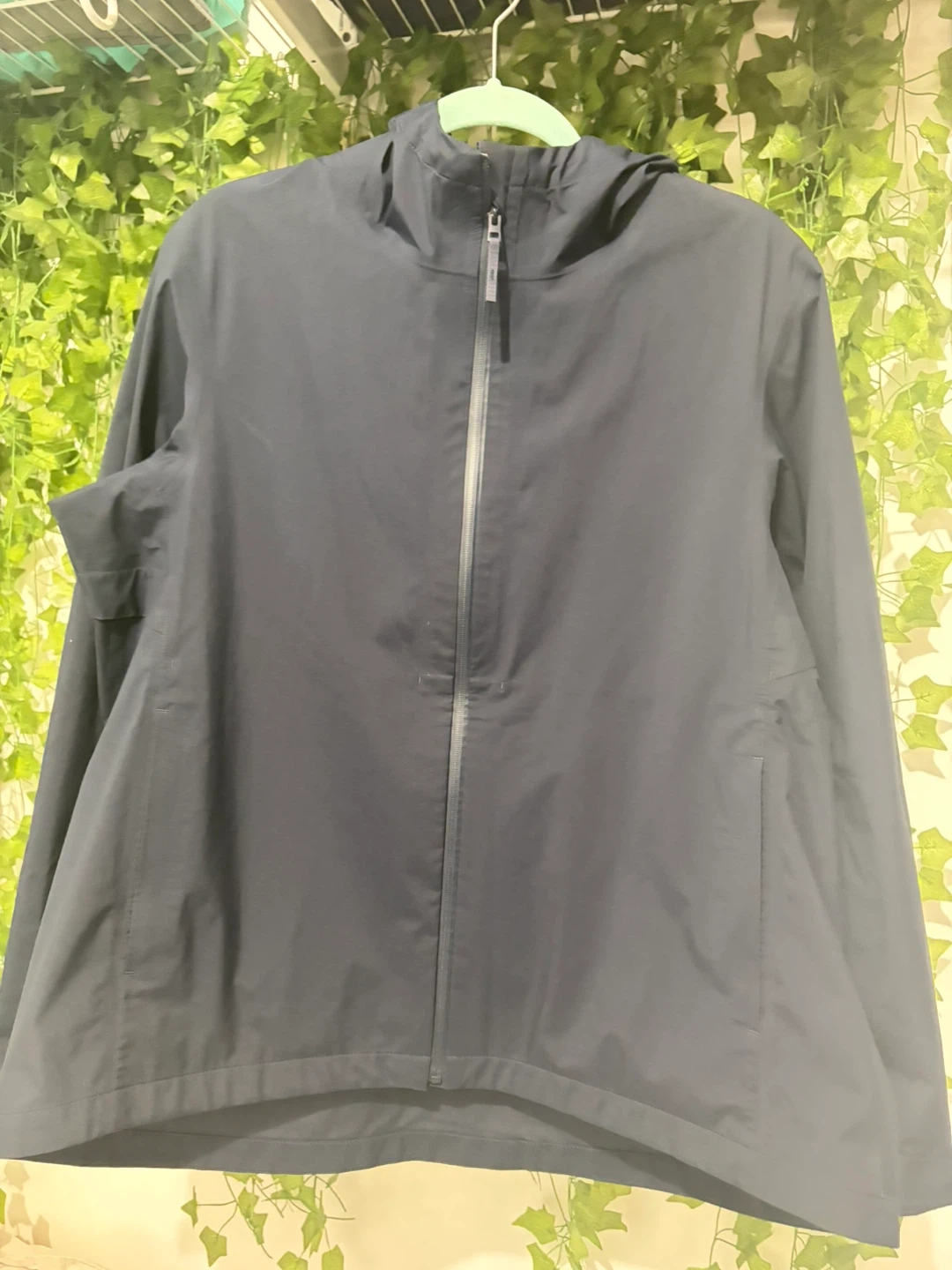 Uniqlo hooded jacket in navy. Lightweight and water-resistant material. Features a full zip front and two side pockets. Great for everyday wear!