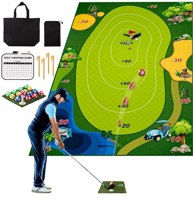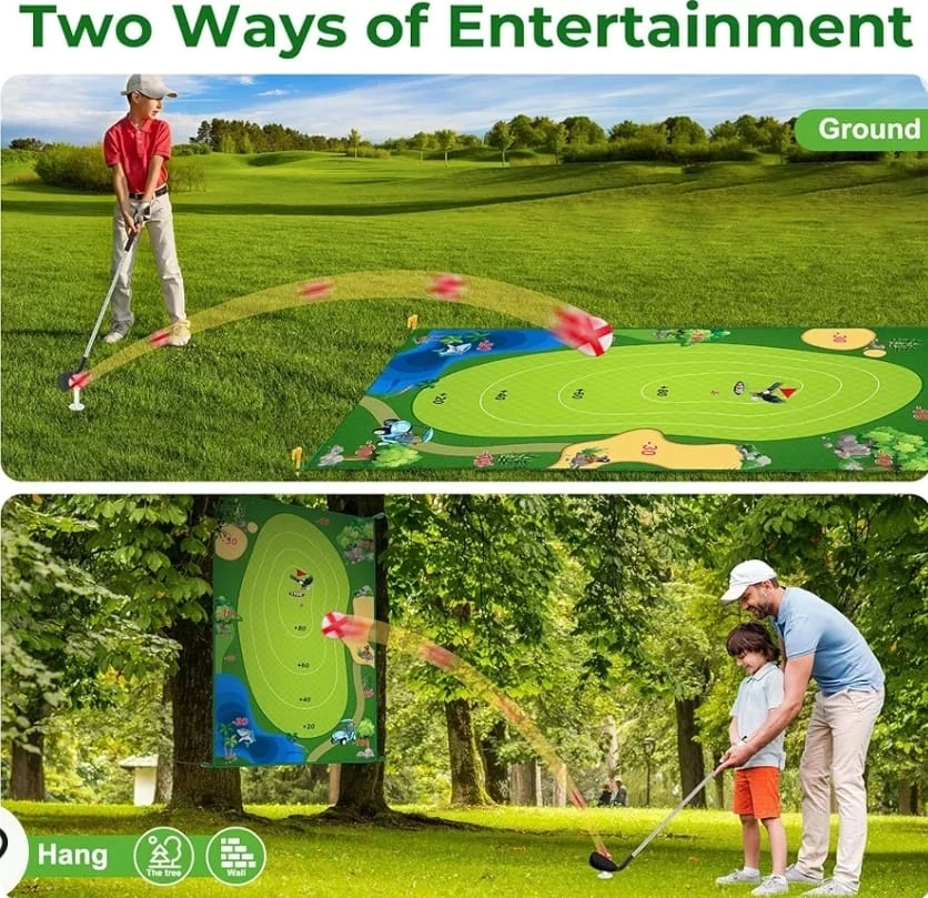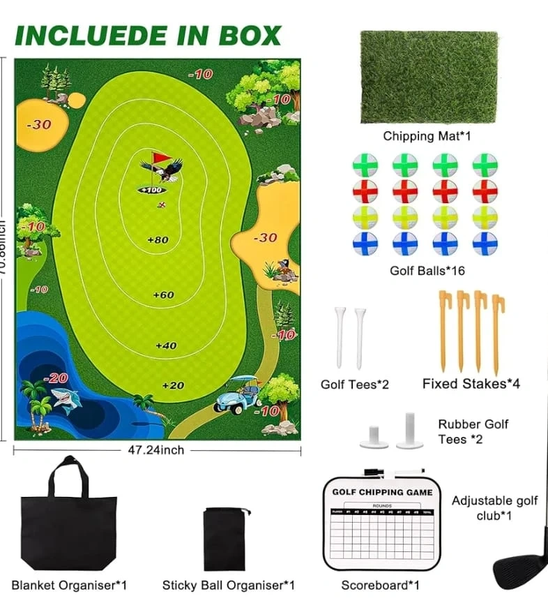 Includes everything you need to play mini golf. Game mat, 16 golf balls, 2 golf tees, 4 fixed stakes, 2 rubber golf tees, adjustable golf club, blanket organiser, sticky ball organiser, and scoreboard. Can be played on the ground or hung on a wall.