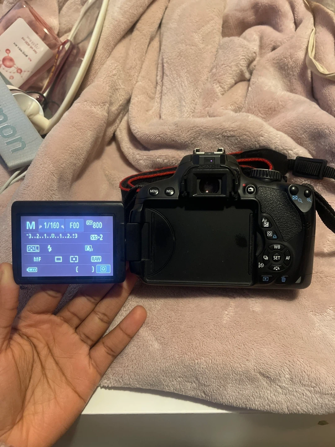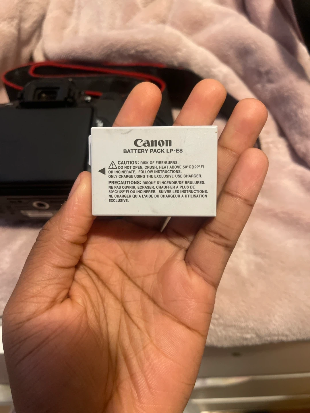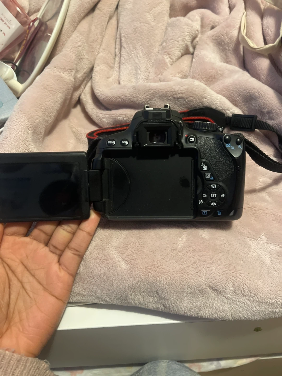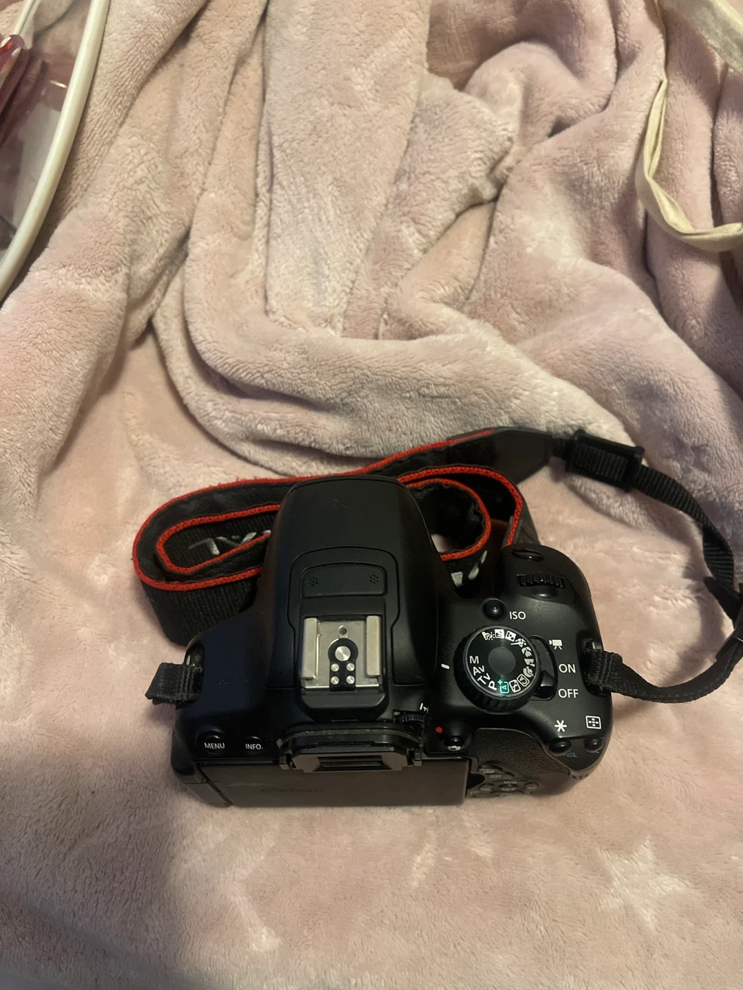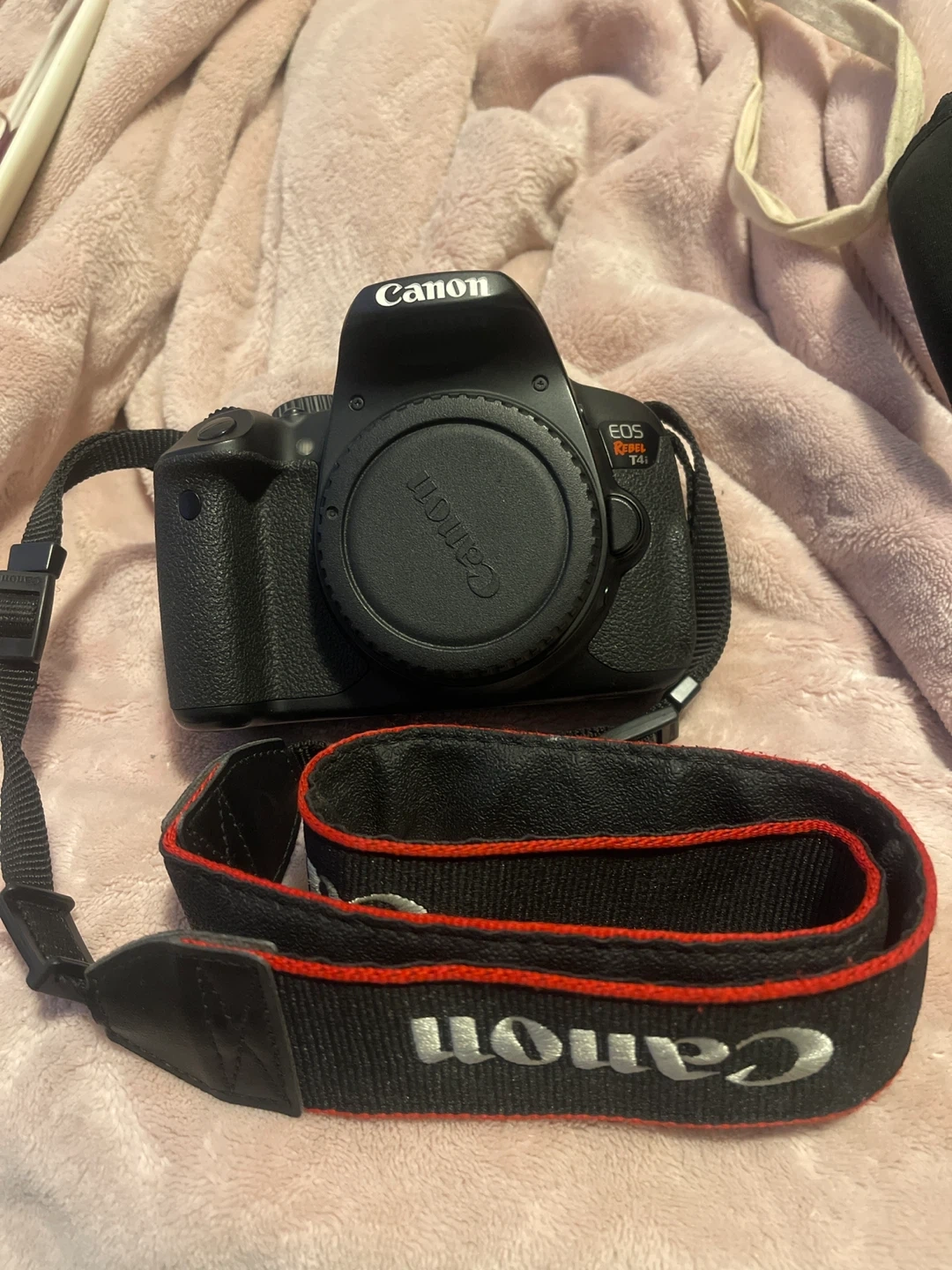 This is a Canon EOS Rebel T4i DSLR camera. It comes with a Canon LP-E8 battery pack and a neck strap. The camera has a flip-out screen for easy viewing.
