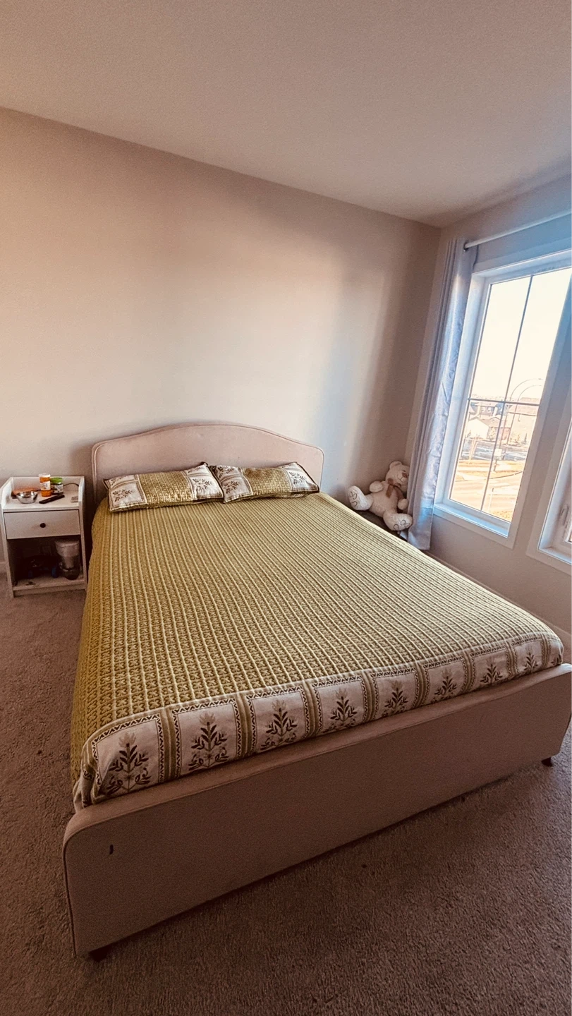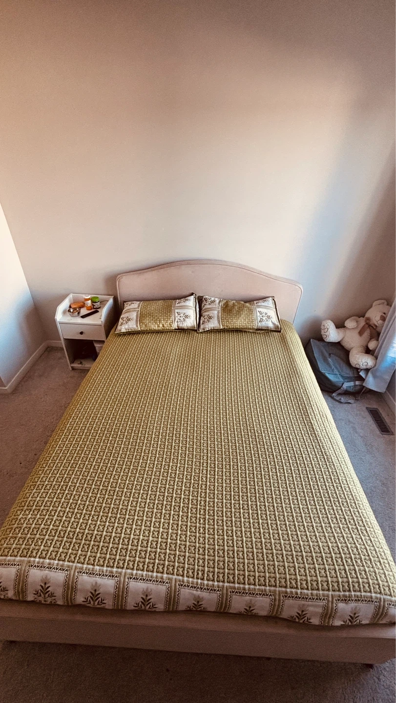 This queen size bed frame comes with a cushioned headboard and includes a decorative bedspread and two pillows. It's a sturdy base for any mattress. Perfect for a master bedroom or guest room!