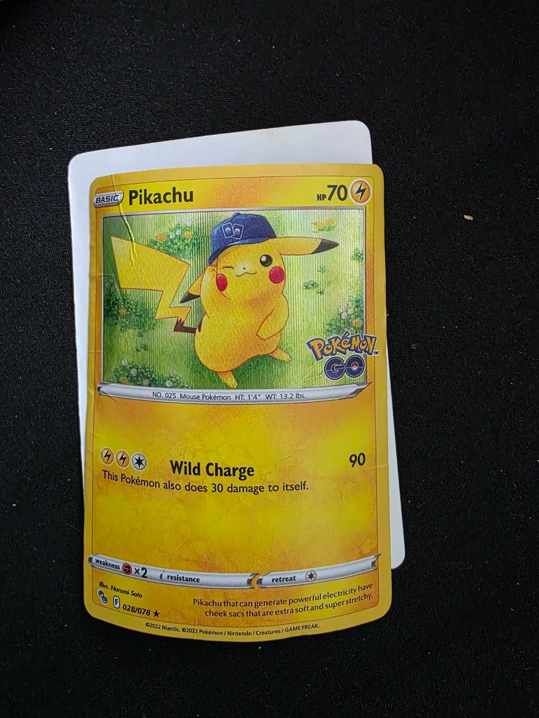 It has 70 HP and the 'Wild Charge' attack. The card's number is 028/078. Promo card included. Slight damage.