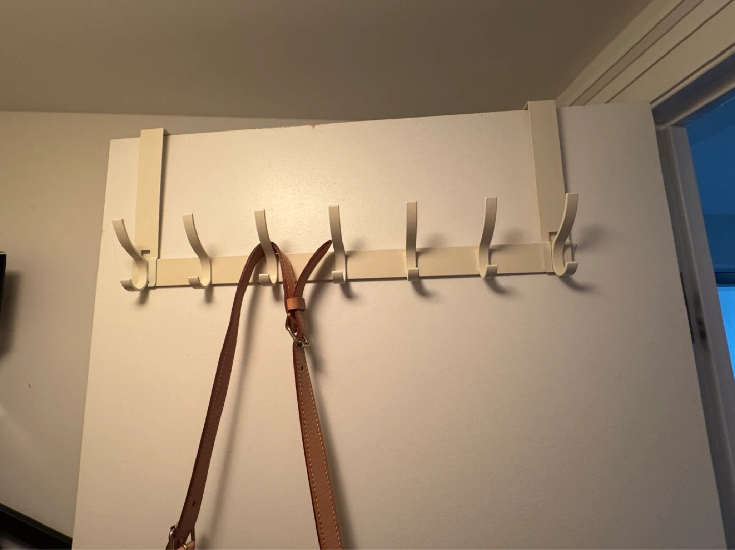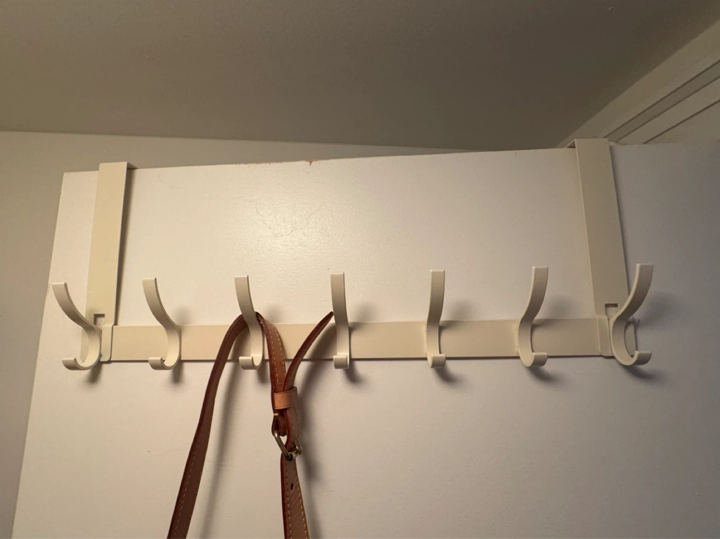 This over-the-door rack has seven hooks for hanging coats, bags, or other items. It's cream-coloured and made of metal. It's great for quick storage in any room!