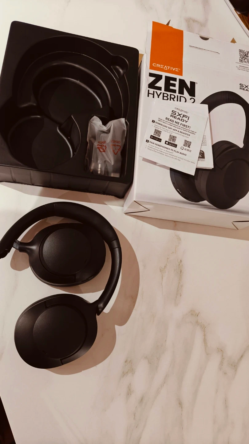 Experience immersive audio with these black Creative Zen Hybrid 2 over-ear headphones. They feature a foldable design for easy storage and portability. Connect wirelessly or with the included cable.Creative Zen Hybrid 2 over-ear headphones in white and tan. Includes original box and charging cable. Features SXFI Ready technology.