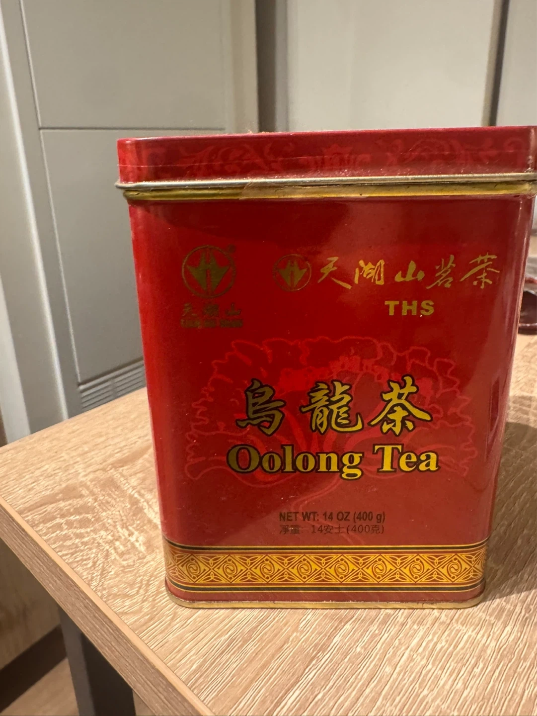 THS Oolong Tea in a decorative red tin. This tin contains 14 oz (400 g) of oolong tea. It's a great way to store your tea and keep it fresh!