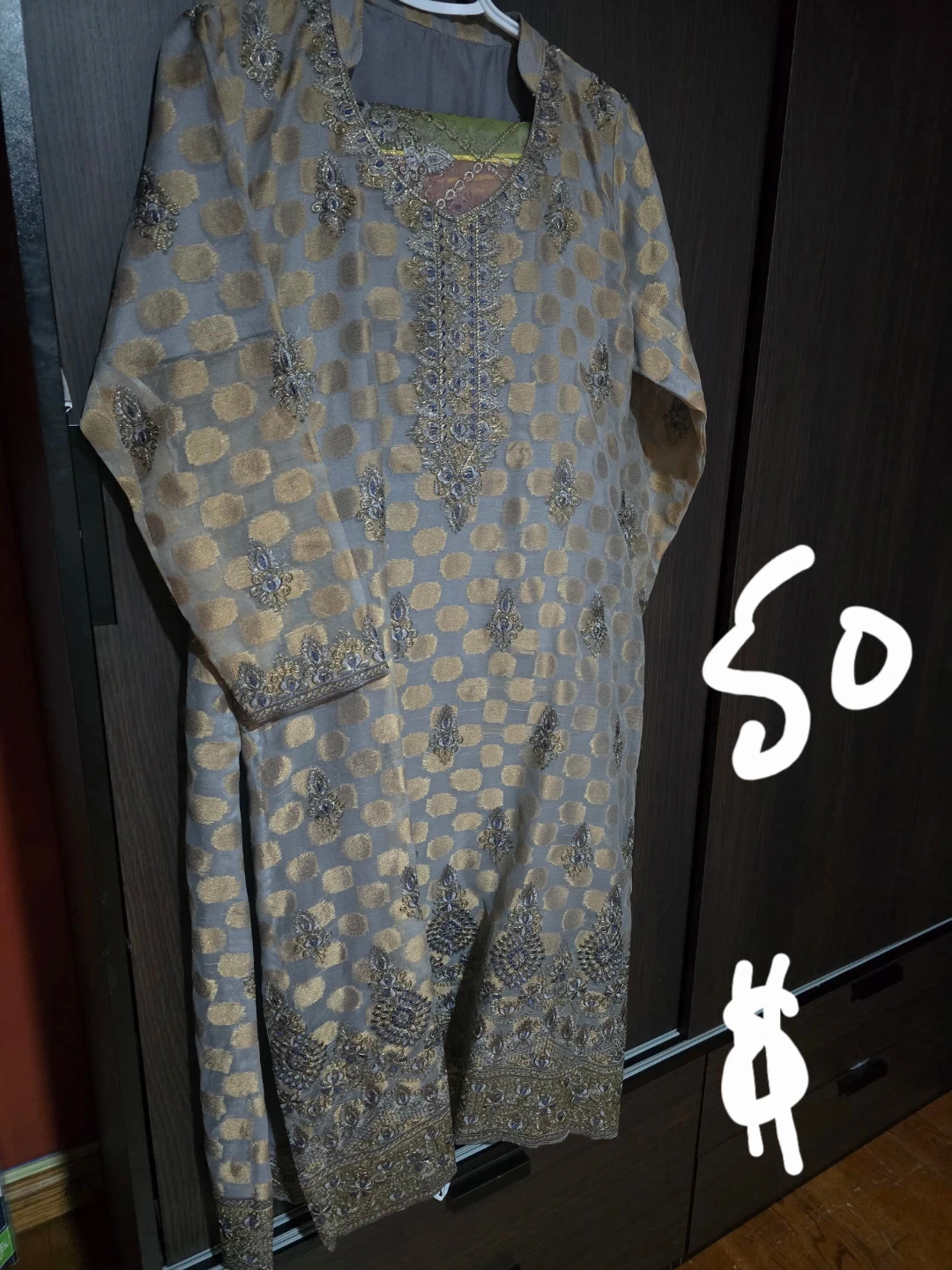 A lovely 3 piece dress with intricate gold embroidery on a grey base. Features detailed embellishments along the neckline and hem. It's made of a textured fabric perfect for special occasions.