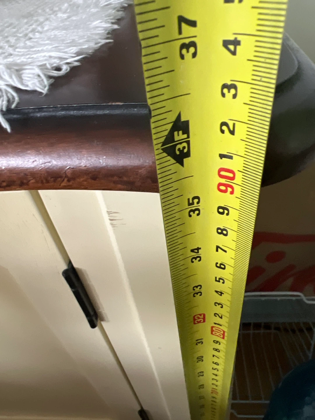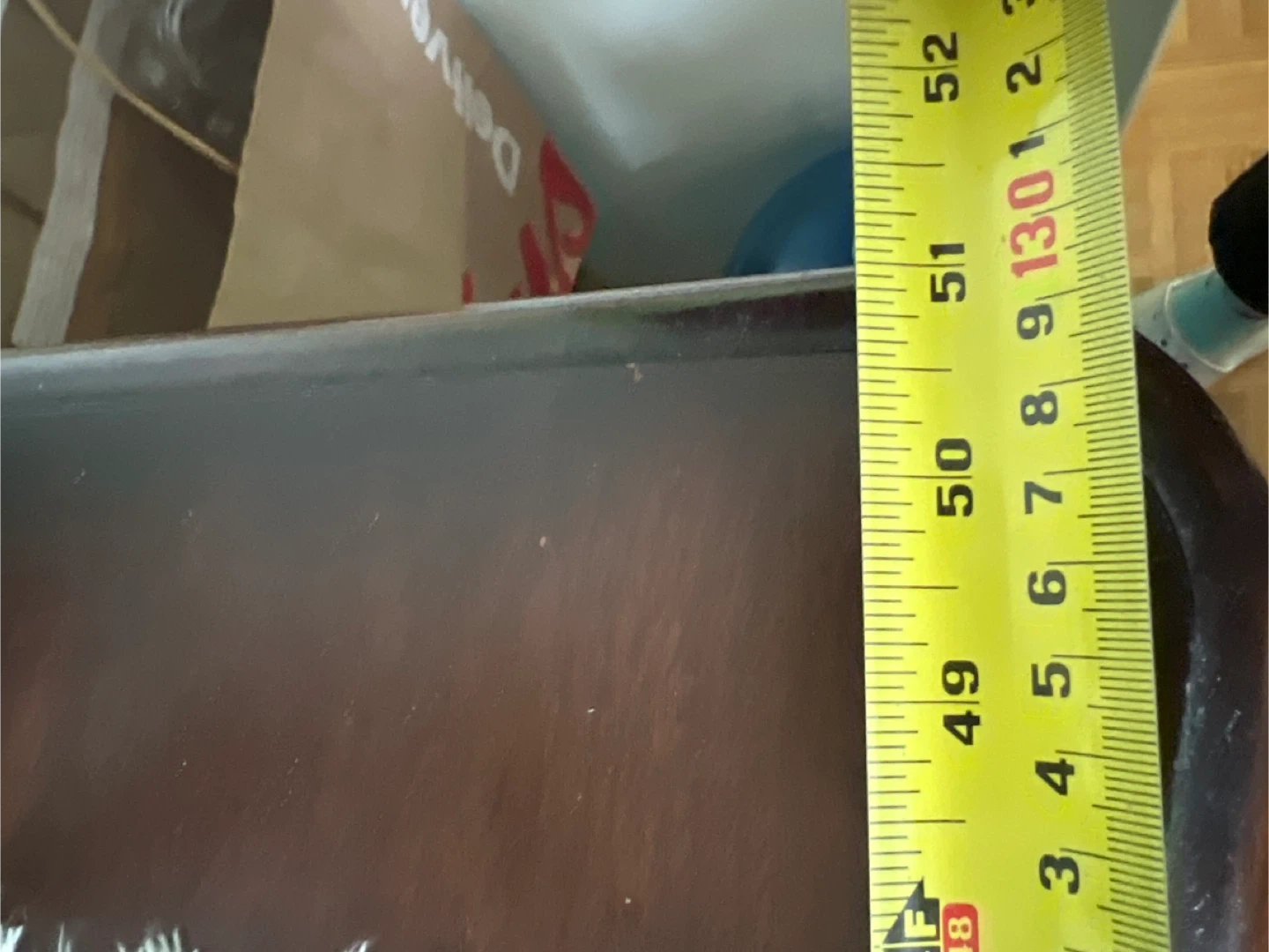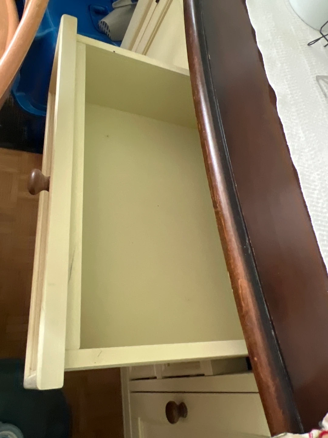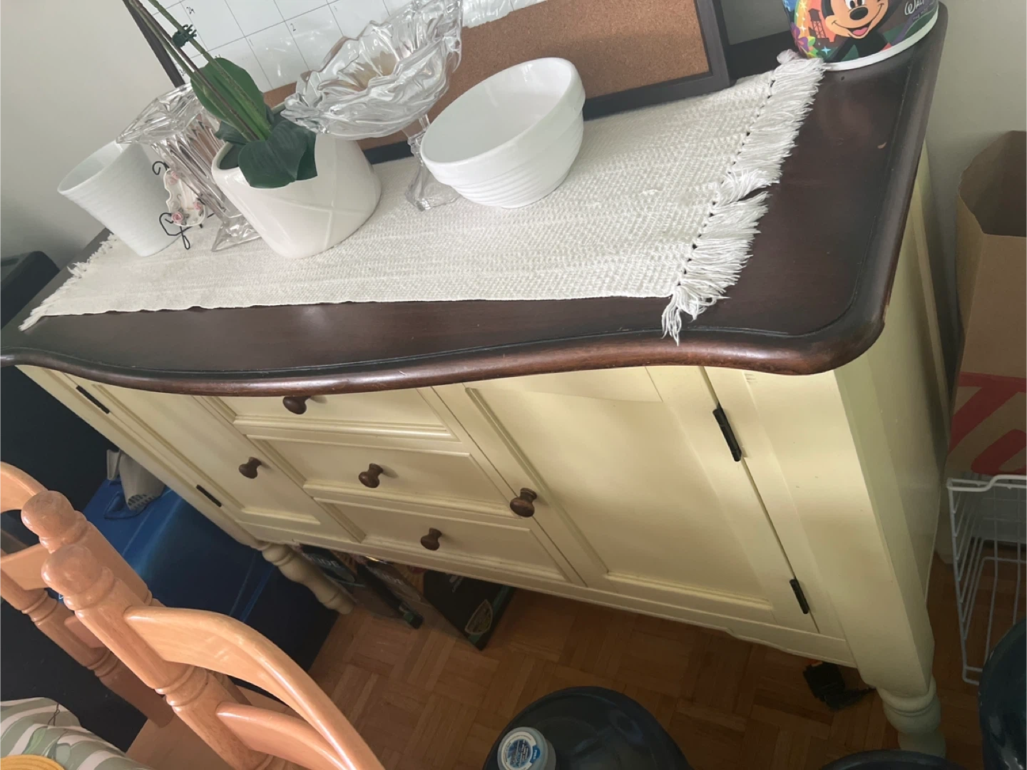 This buffet features a cream-coloured body with a dark wood top and detailing. It has multiple drawers and cabinet doors for storage. Dimensions are approximately 52 inches long and 37 inches high.
