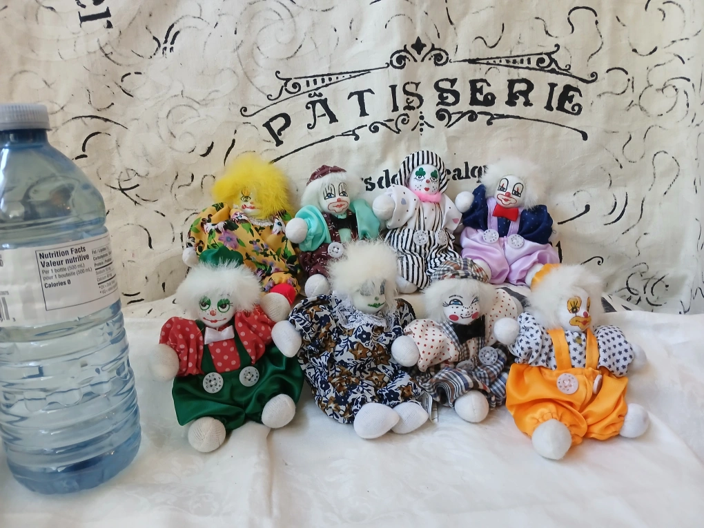 Selling a collection of 8 unique vintage Hubao clown dolls. Each doll has its own distinct outfit and expression. 5 inches with porcelain head, feet and hands. Popular in the 1980s with collectors. Fun and quirky.