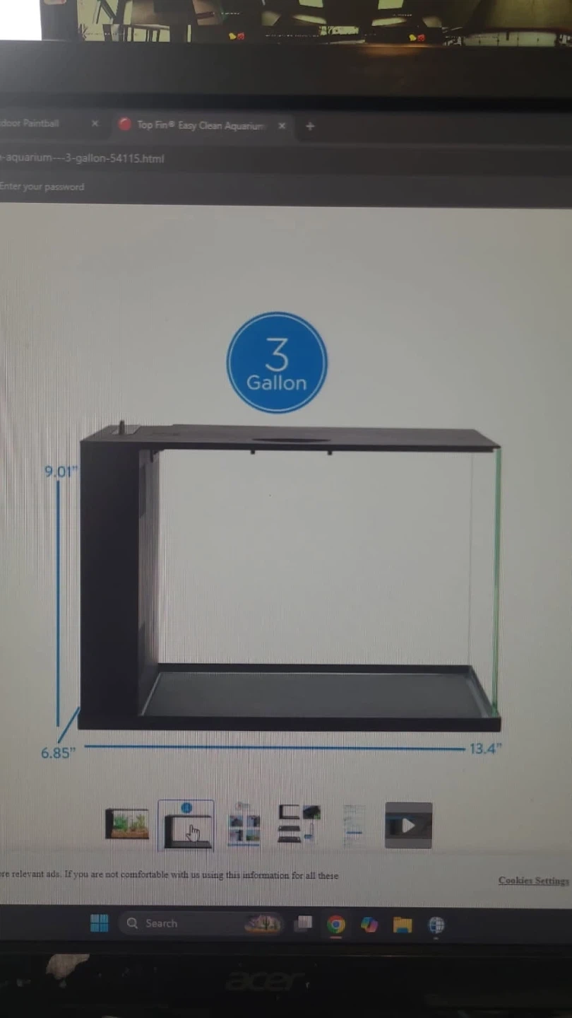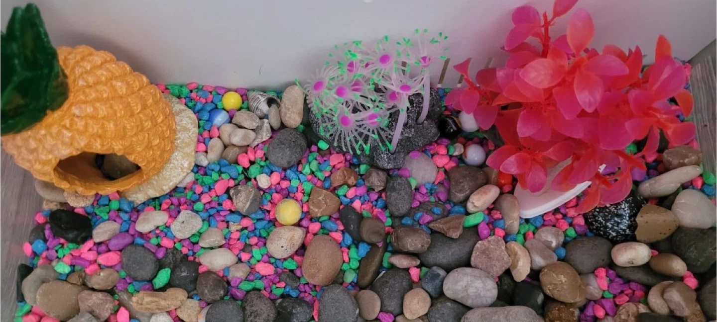 This is a 3-gallon Top Fin aquarium with light. It includes colourful gravel, a pineapple decoration, and two artificial plants. Glass construction with a white lid. Hydrochange technology.
