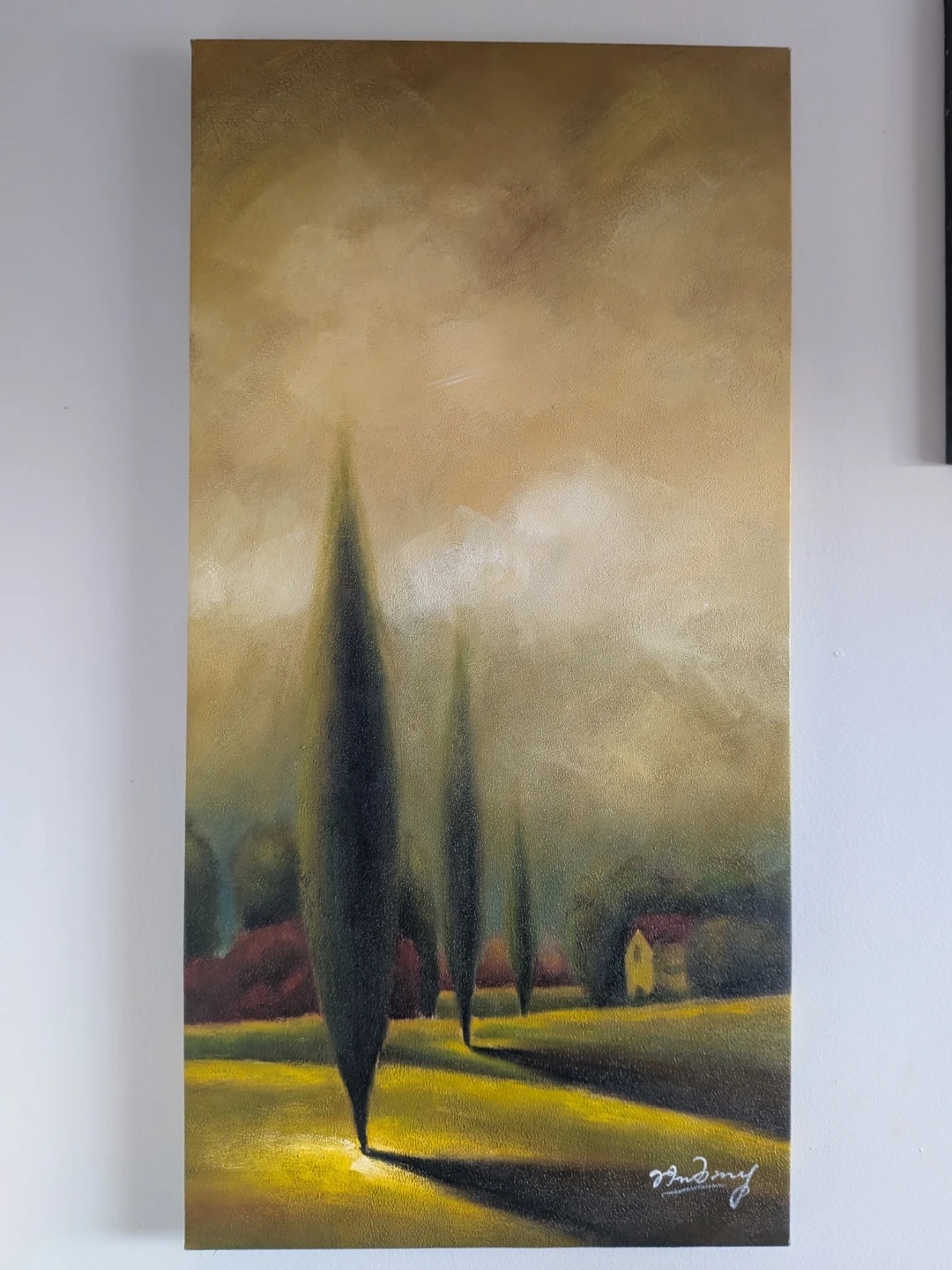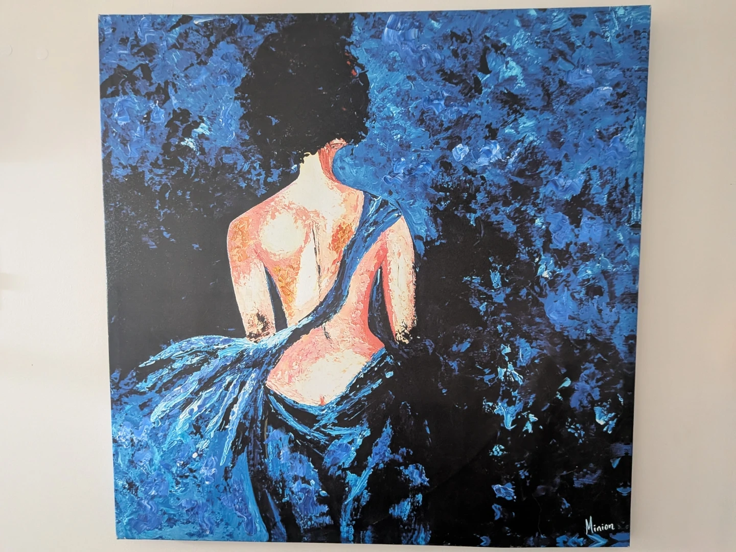 A textured acrylic painting depicting a woman in a blue dress. The artwork features bold brushstrokes and a vibrant colour palette. It's signed by the artist, 'Minion'.