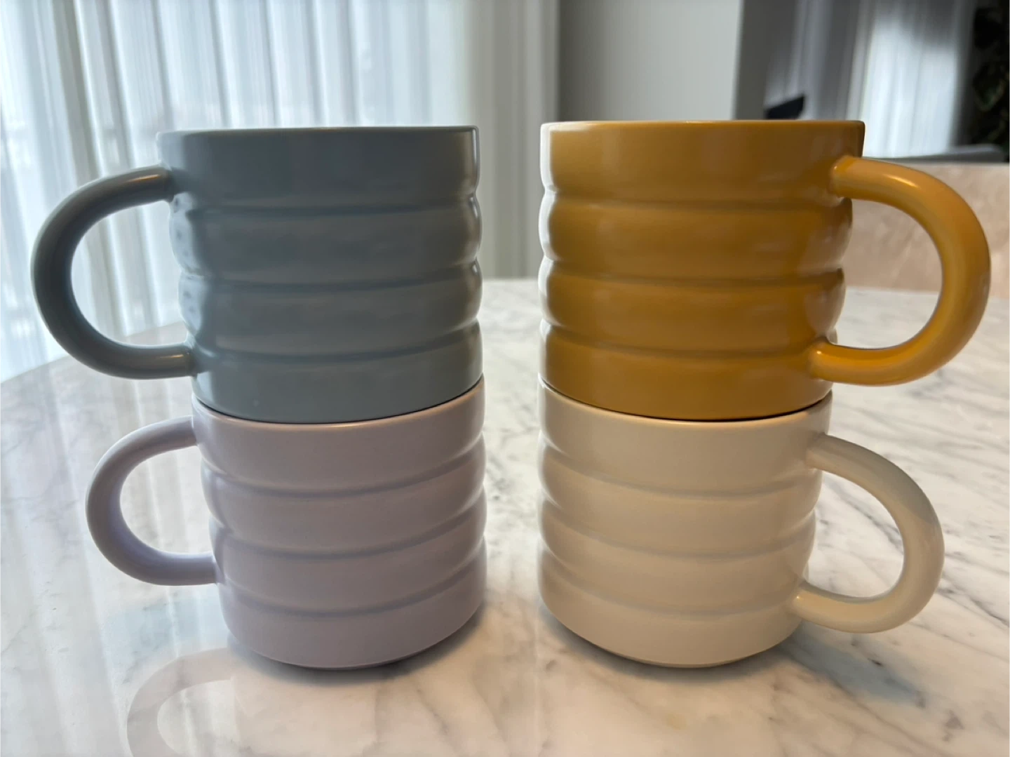 These four stackable mugs come in a grey, lavender, mustard yellow, and off-white colour. They're made of ceramic and have a ribbed design. Easy to store and perfect for your morning coffee!