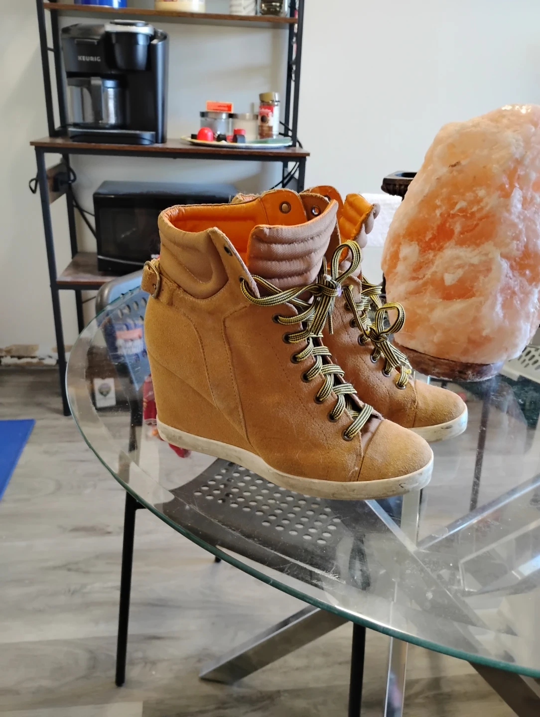 Comfortable wedge sneakers with a suede-like finish and lace-up closure. Features a padded collar and adjustable ankle strap. Good for casual wear!