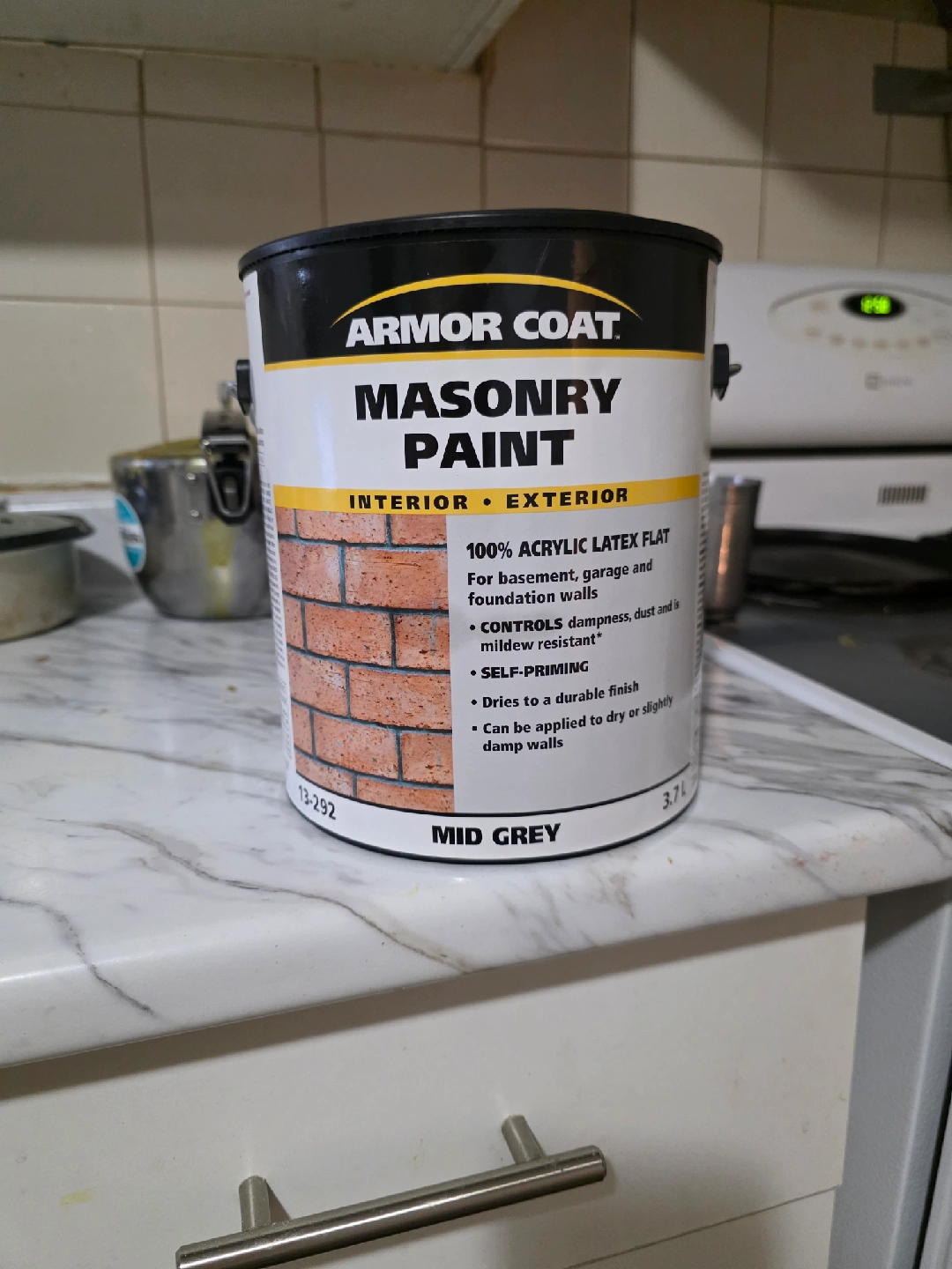 Selling a can of Armor Coat Masonry Paint in Mid Grey. It's a 3.7L can, perfect for interior or exterior use. This 100% acrylic latex flat paint is great for basements, garages, and foundation walls. It controls dampness, dust, and is mildew resistant, plus it's self-priming and dries to a durable finish
