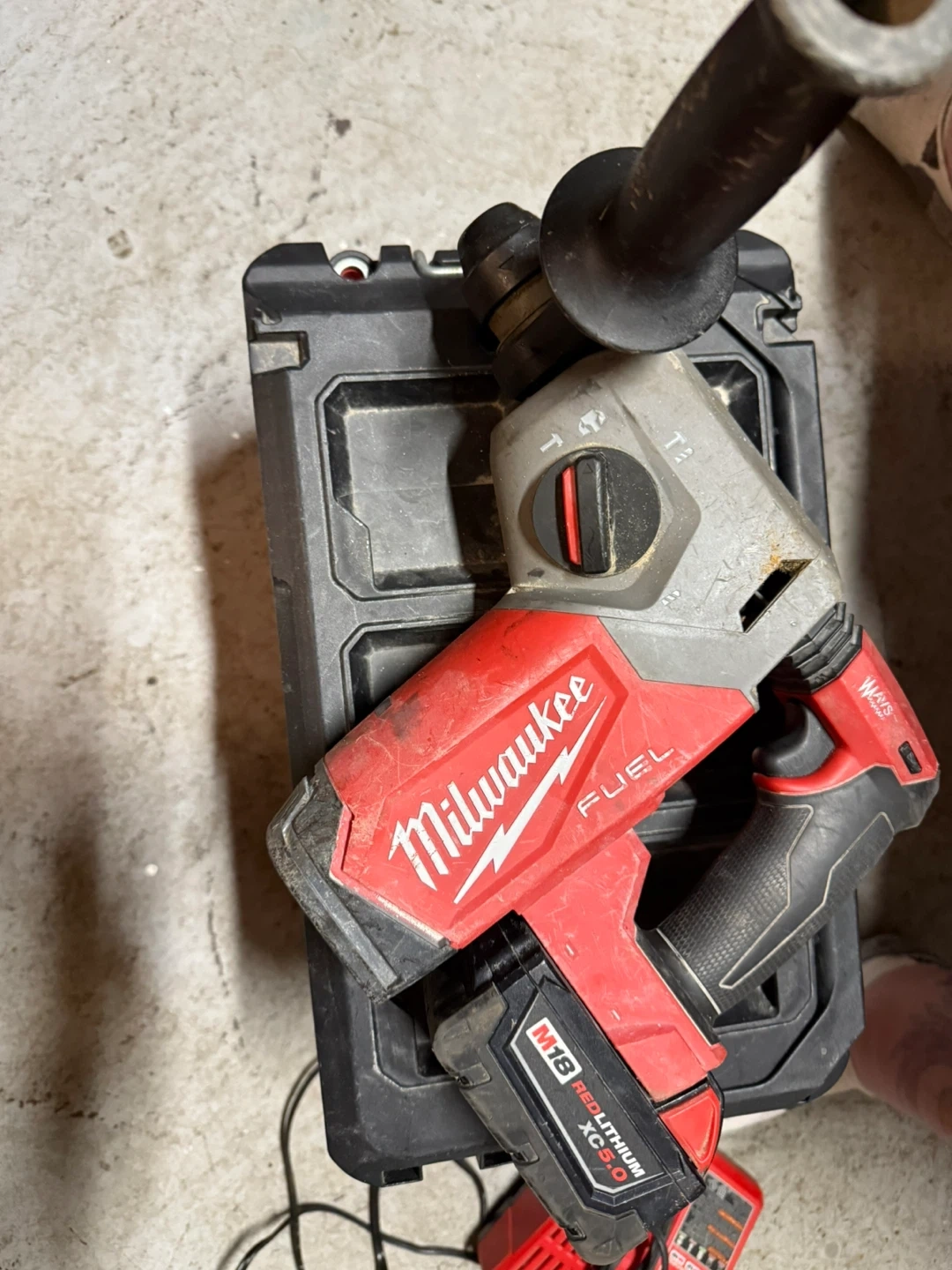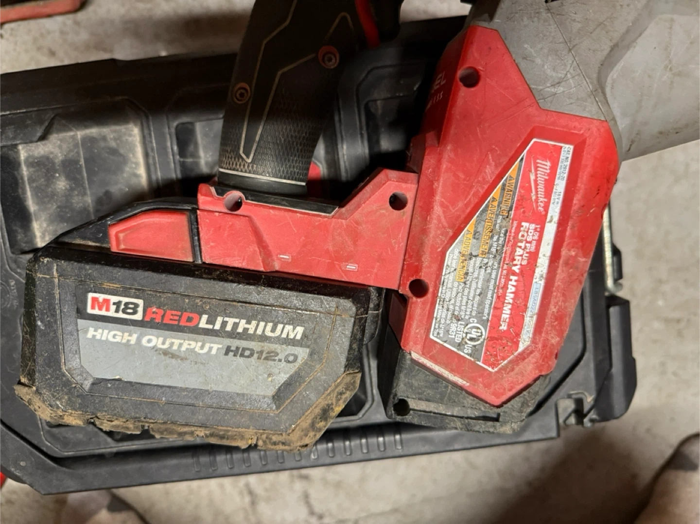 Milwaukee M18 REDLITHIUM HIGH OUTPUT HD12.0 battery powered SDS Plus Rotary Hammer. Includes charger and large capacity battery.