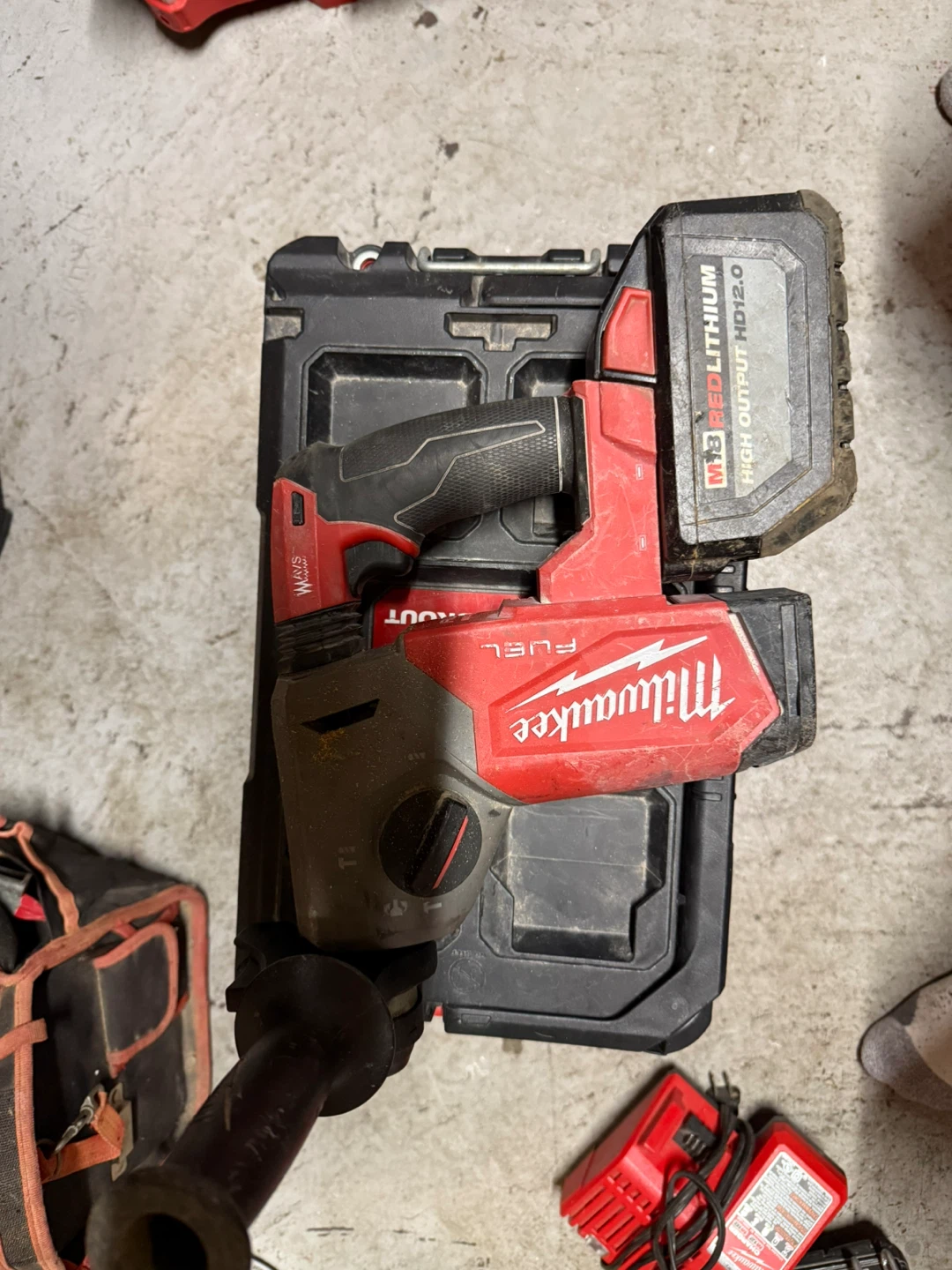 Milwaukee M18 REDLITHIUM HIGH OUTPUT HD12.0 battery powered SDS Plus Rotary Hammer. Includes charger and large capacity battery.