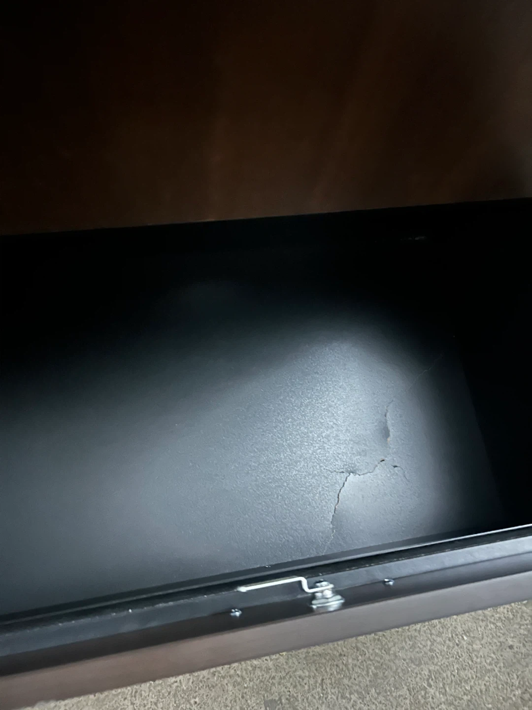 This filing cabinet has two drawers for storage. Botton drawer has a small crack but still sturdy. It's a dark brown colour. Dimensions are approximately 29 inches high and 21 inches wide.