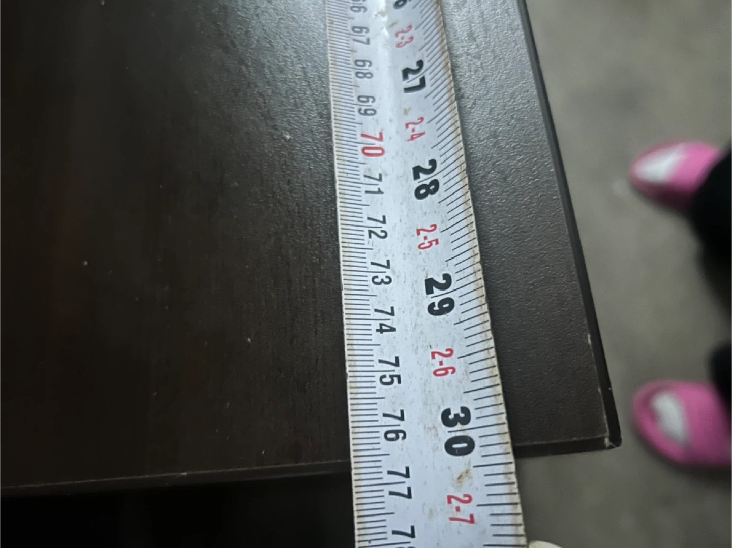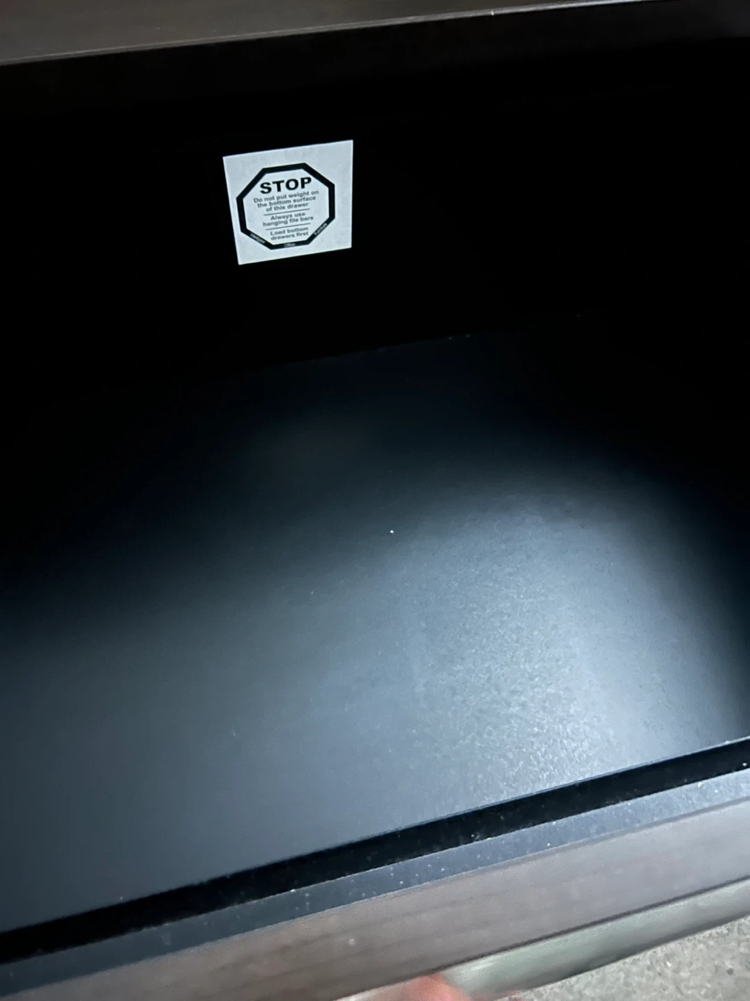 This filing cabinet has two drawers for storage. Botton drawer has a small crack but still sturdy. It's a dark brown colour. Dimensions are approximately 29 inches high and 21 inches wide.