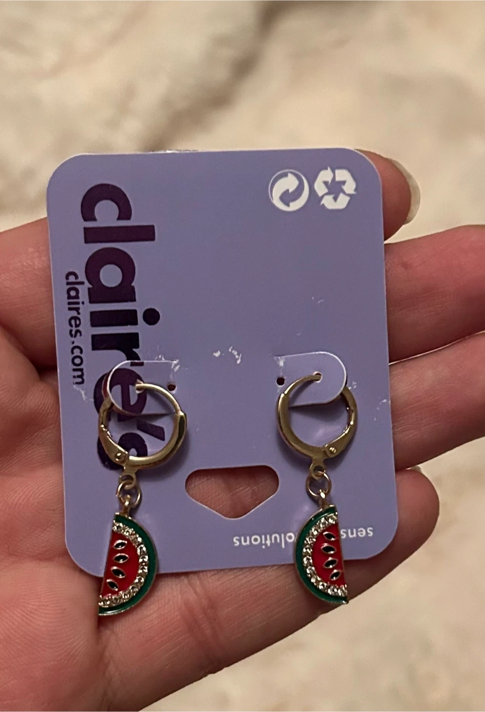 Cute watermelon slice dangle earrings from Claire's! These earrings have a gold-tone hoop and a colourful watermelon charm with rhinestones. They're perfect for adding a fun, fruity touch to any outfit.