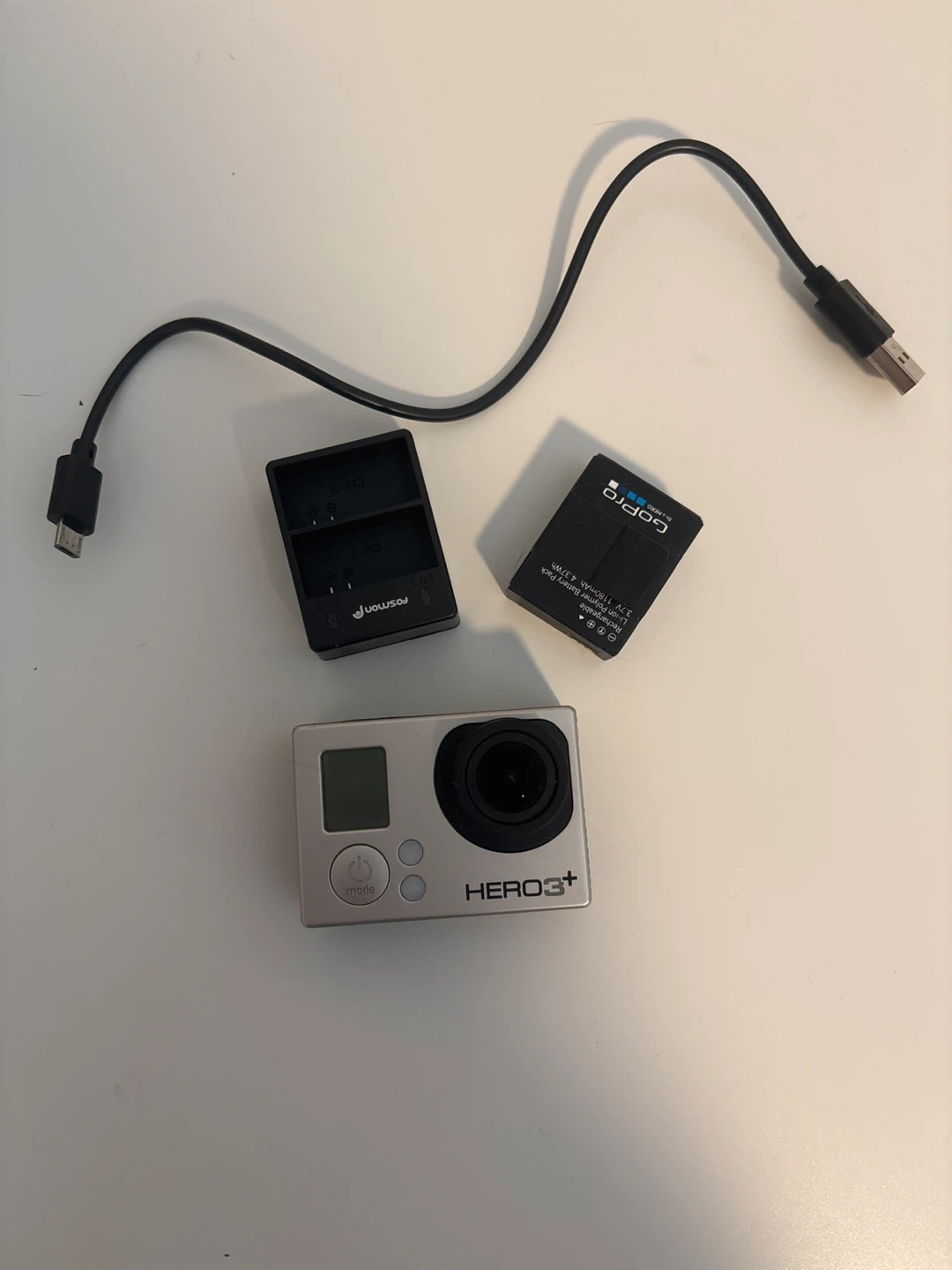 Capture your adventures with this GoPro HERO3+ camera. It's a rechargeable Li-ion Polymer Battery Pack, 3.7V 1180mAh, 4.37Wh. Includes a USB charging cable and cradle.