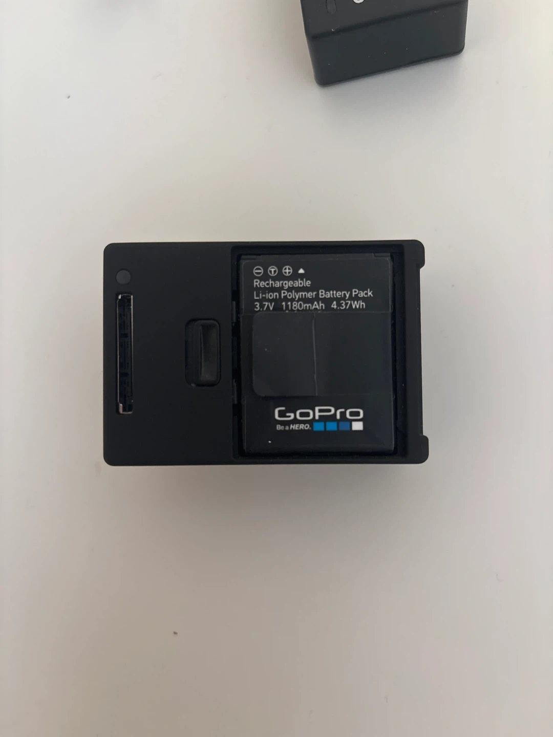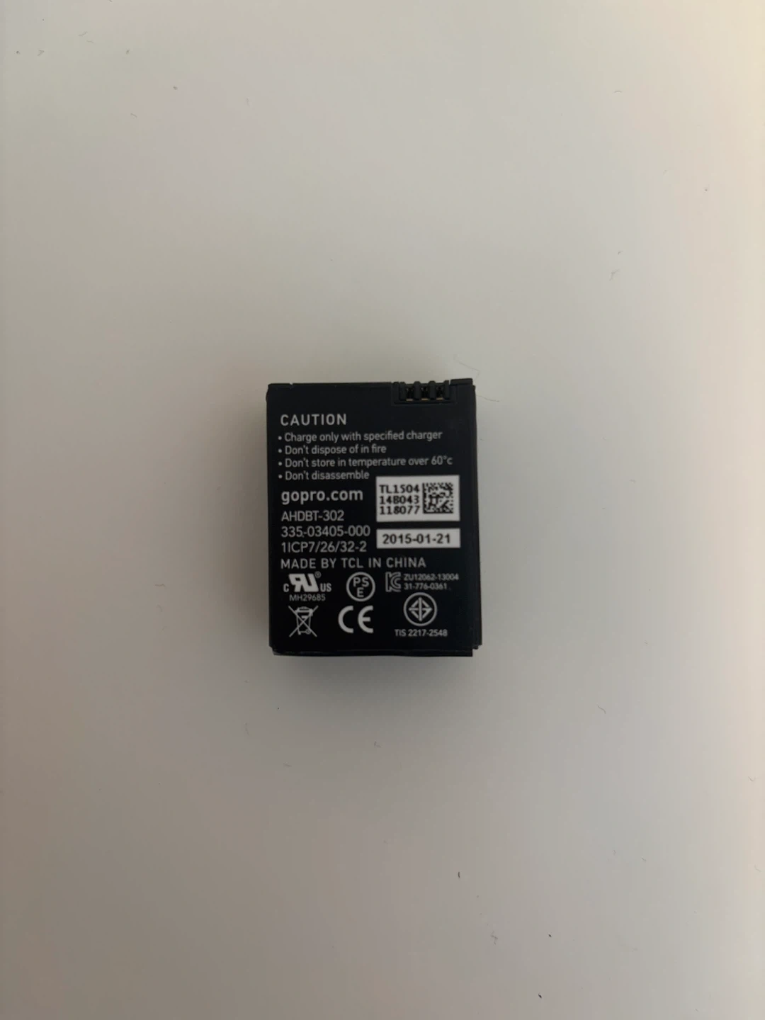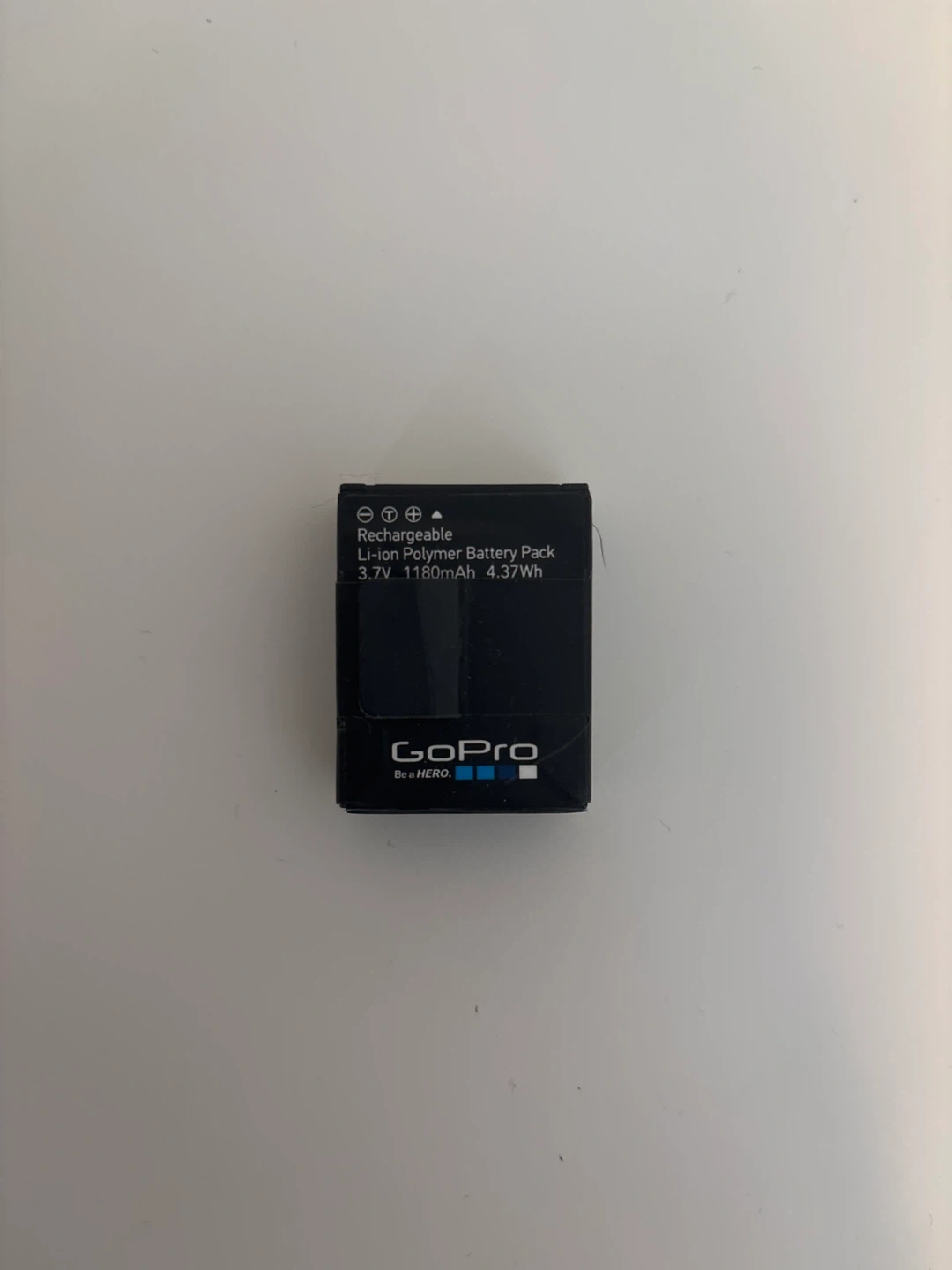 Capture your adventures with this GoPro HERO3+ camera. It's a rechargeable Li-ion Polymer Battery Pack, 3.7V 1180mAh, 4.37Wh. Includes a USB charging cable and cradle.