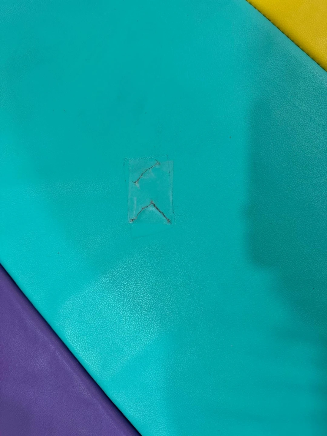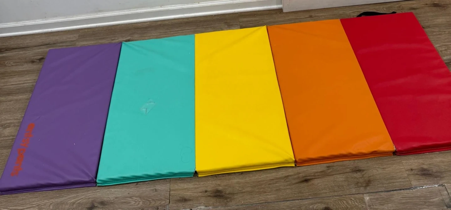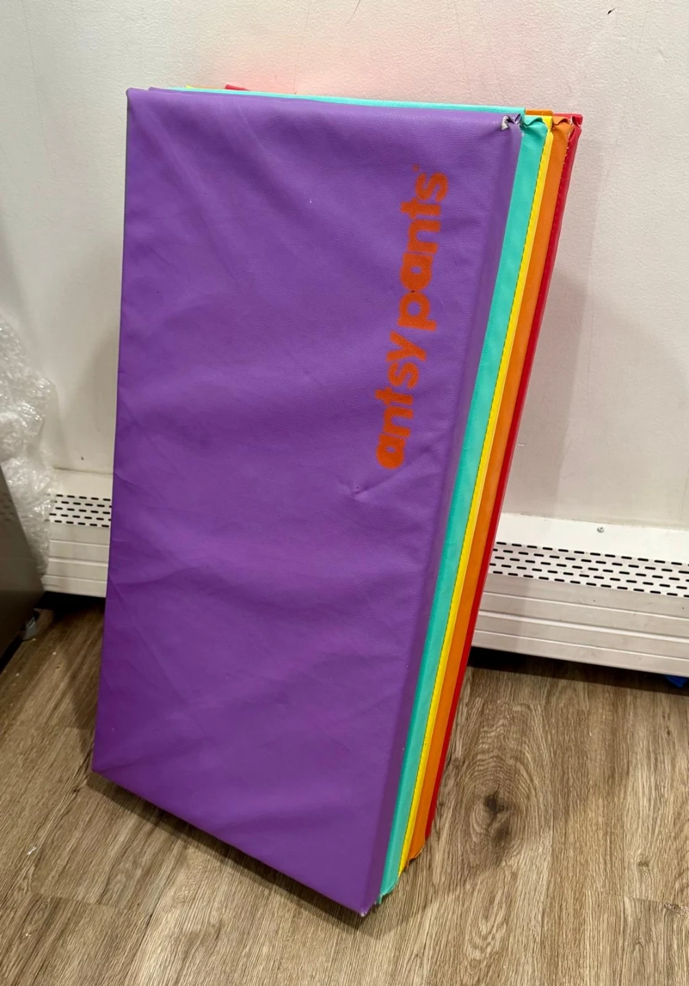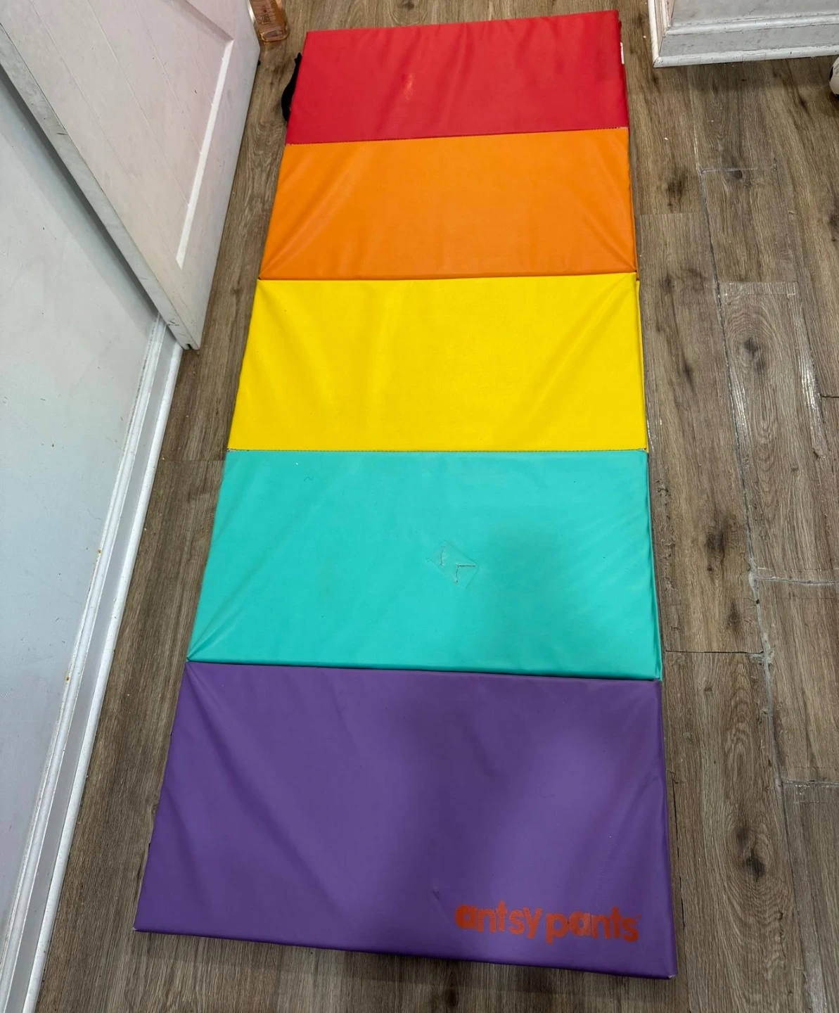 This Artsy Pants play mat features six colorful sections in purple, teal, yellow, orange, and red. It's a soft surface for tummy time or play. There's a small repaired tear on the teal section.