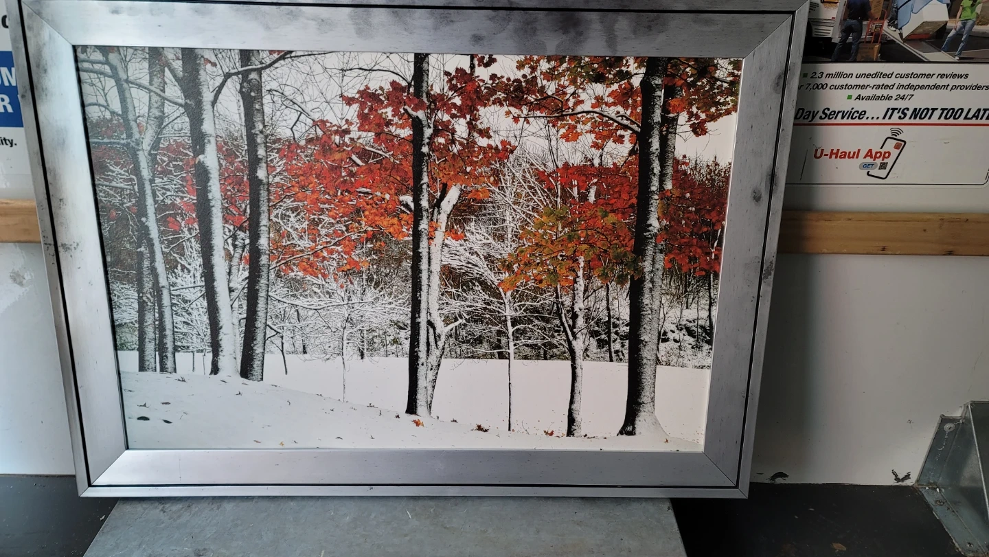 Framed print showcasing a forest scene with autumn leaves and snow. It features a silver-toned metal frame. This artwork adds a touch of nature's contrast to your decor.