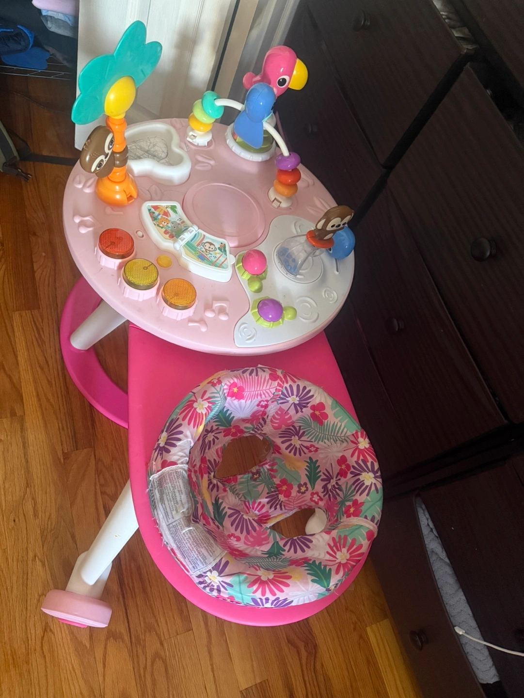 Pink and white baby activity center. Features multiple activities, lights, and sounds. Includes a removable seat with tropical flower print. Great for keeping baby entertained.