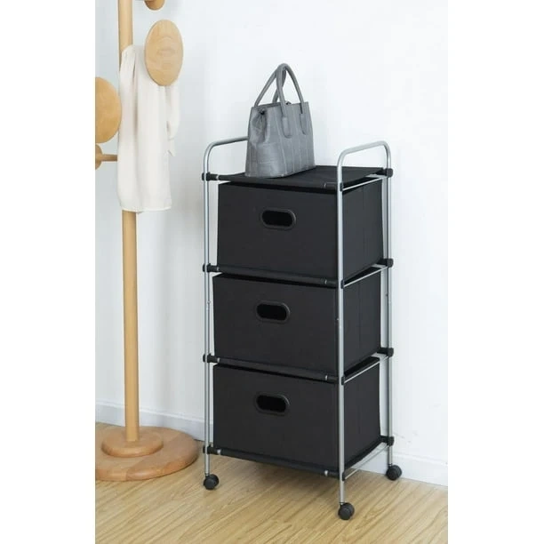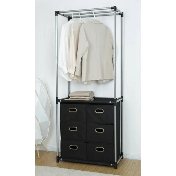 This fabric storage organizer features a metal frame and a hanging rod. It includes six black fabric drawers for ample storage. Its compact design makes it great for closets or small spaces.
