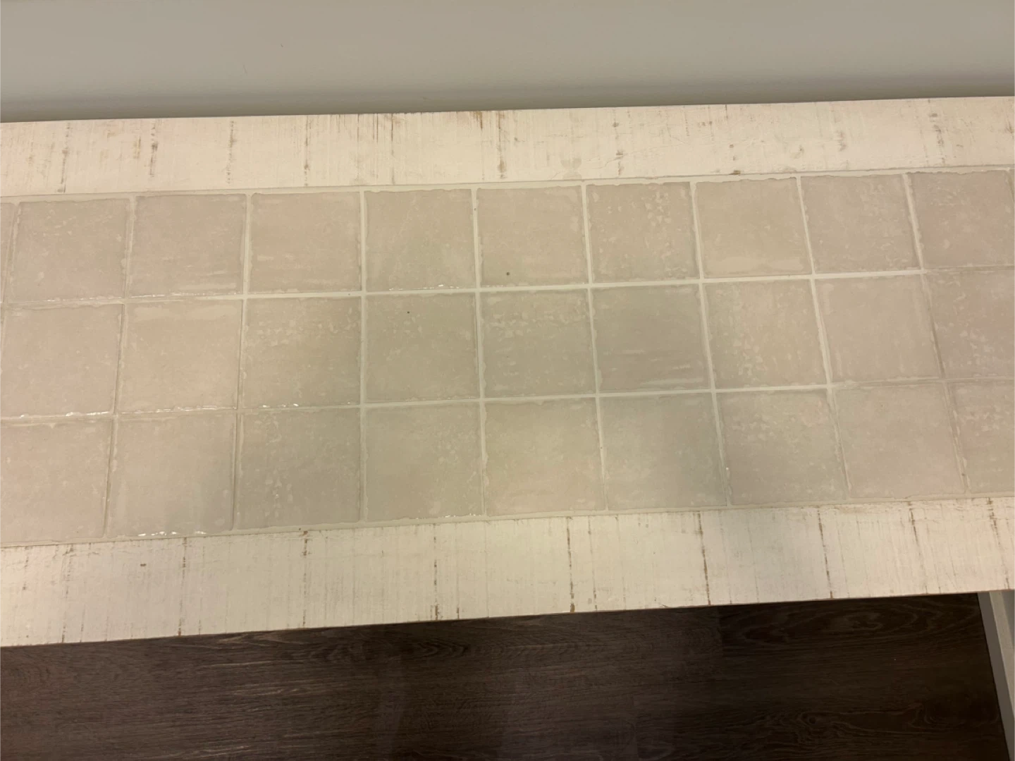 White console cabinet with louvered doors and tiled top. Features two doors with interior shelf for storage.