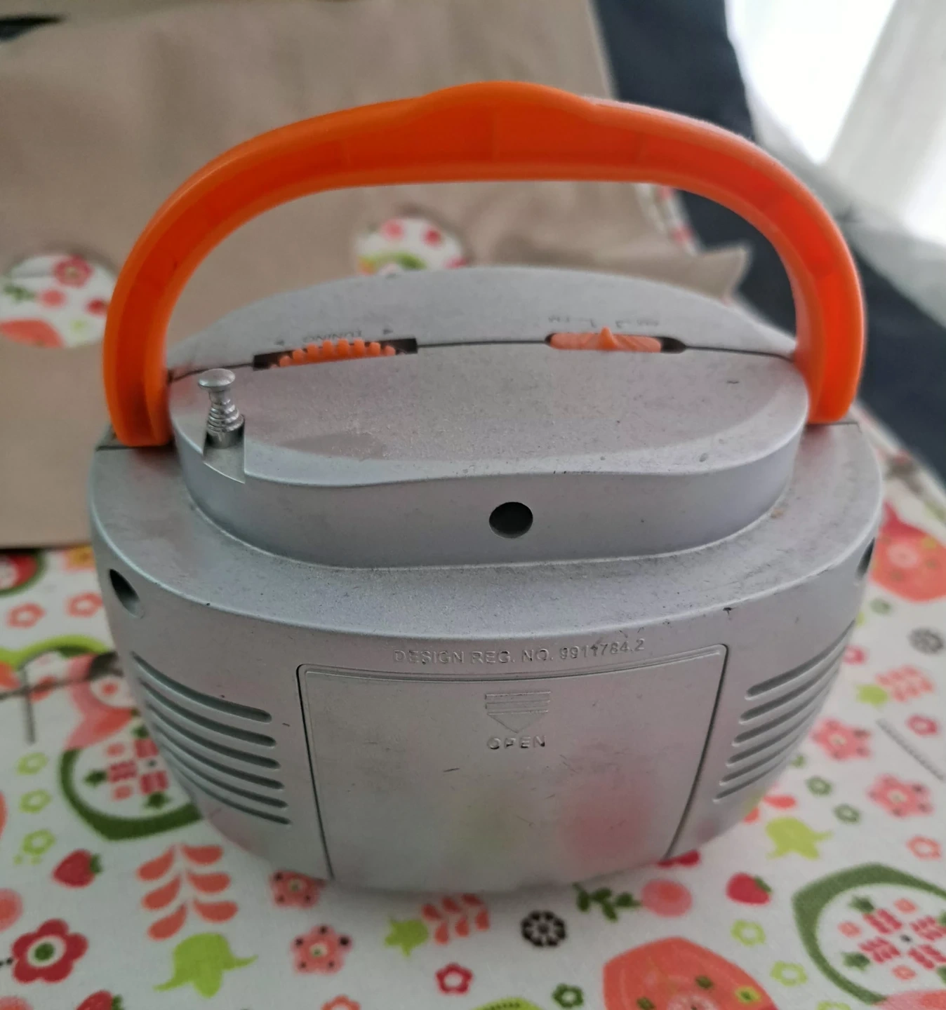 Compact silver and orange portable radio with AM/FM tuning. Features a built-in speaker and an antenna. This radio's portable design makes it easy to take anywhere!