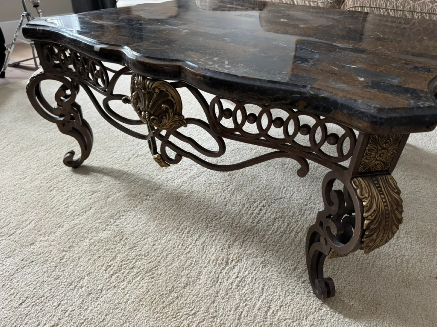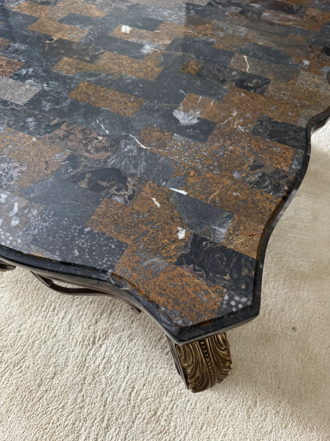 This coffee table features a unique marble top with a mosaic inlay of black, grey, and copper tones. It's supported by a decorative metal base with intricate scrollwork and ornate detailing on the legs. The table's design adds a touch of elegance to any living space.