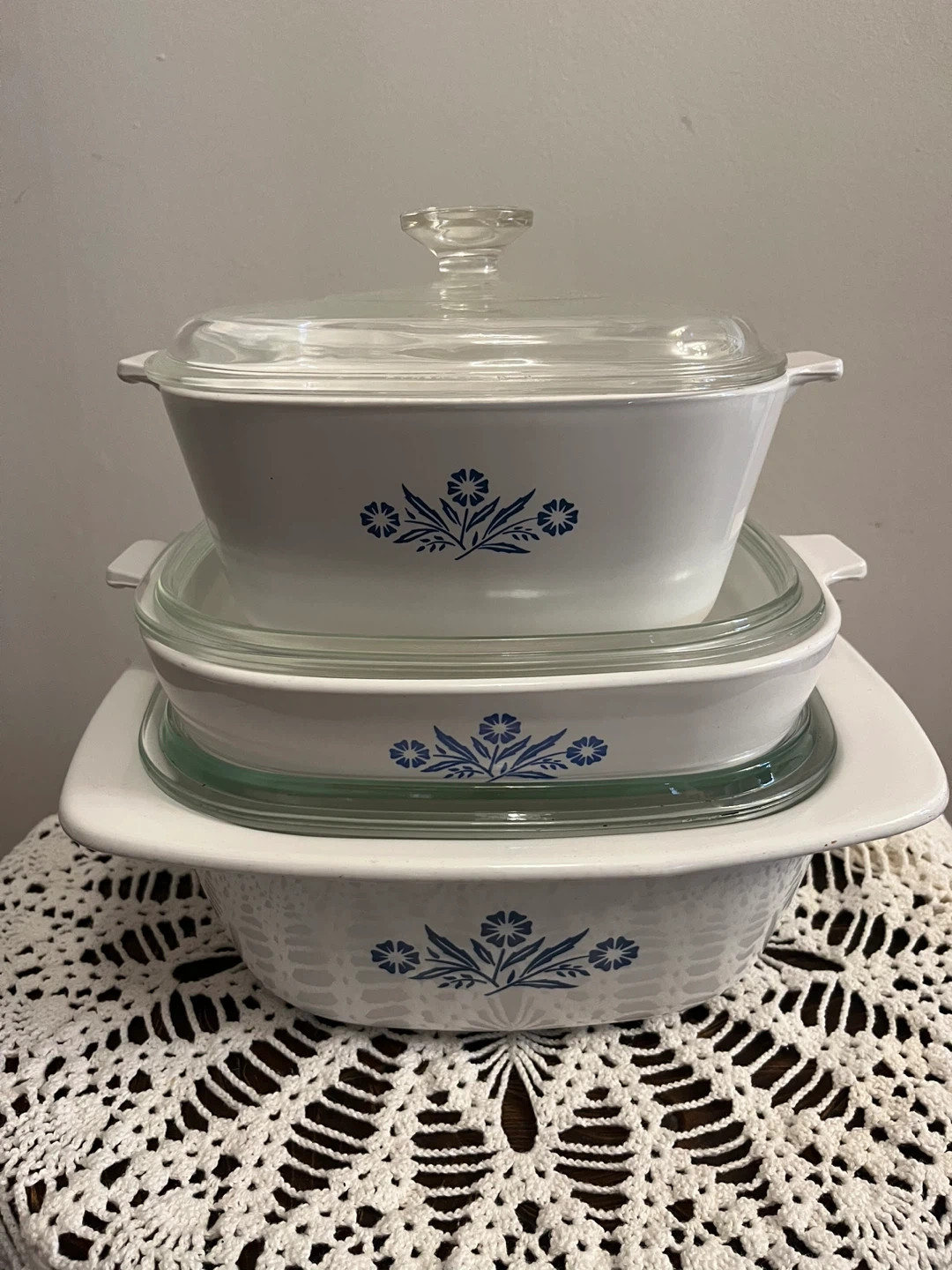 This set includes three white CorningWare casserole dishes with the iconic blue cornflower pattern. They all come with clear glass lids. White ceramic material.
