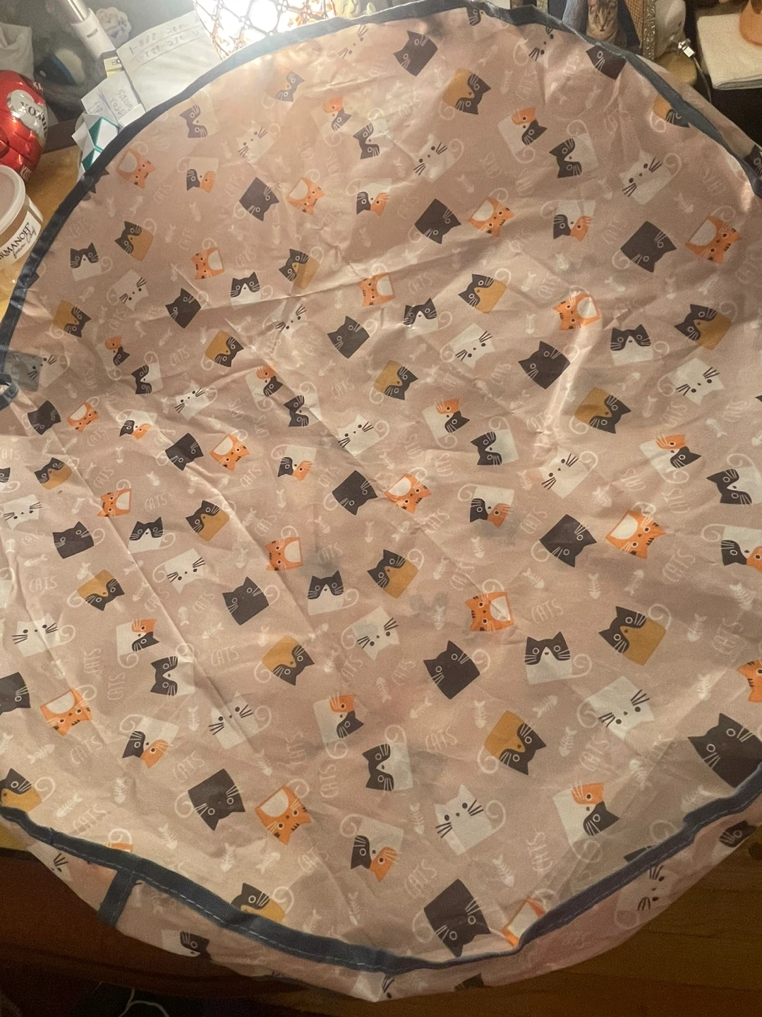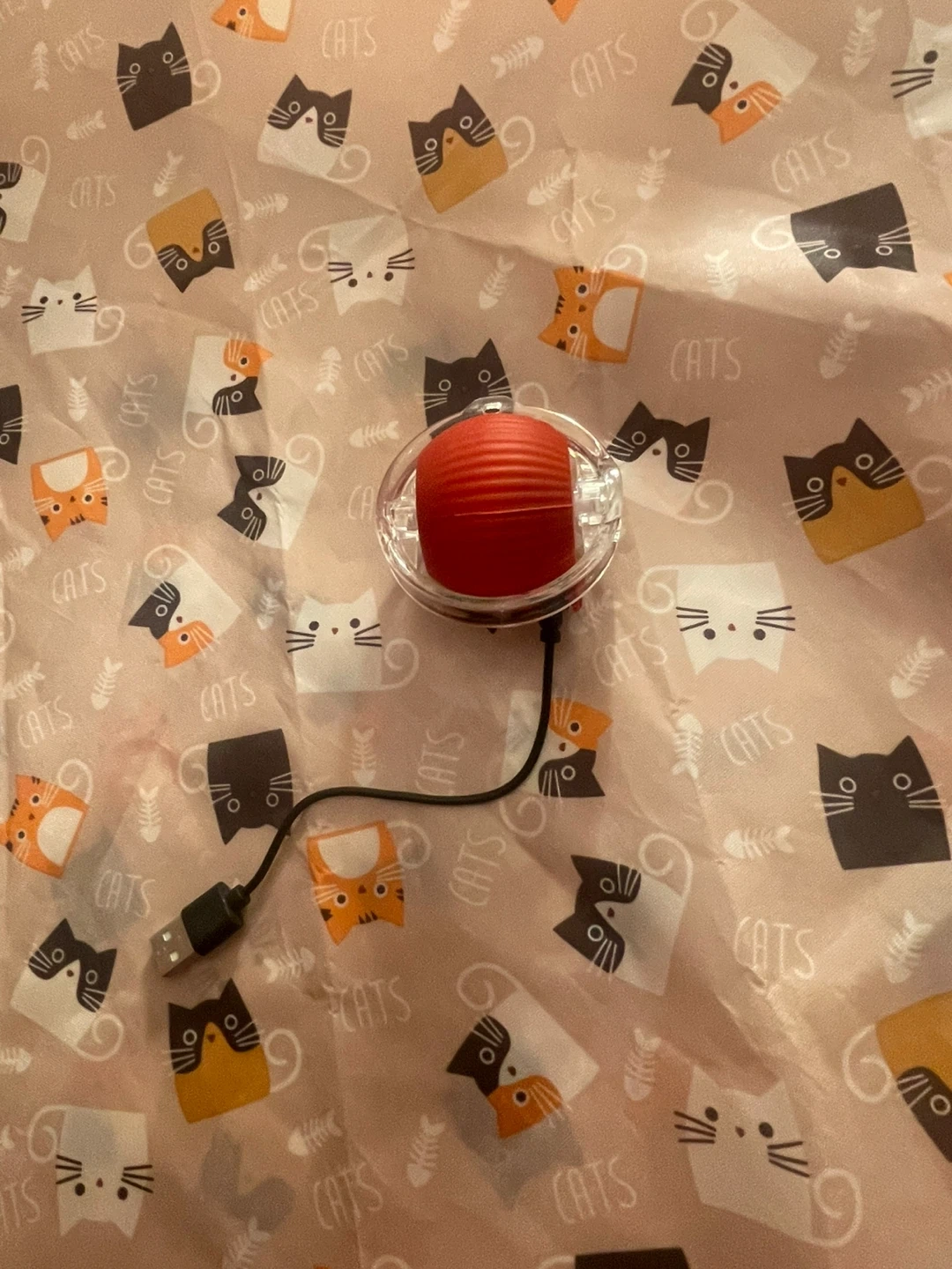 This is a cat-themed play mat with a fun pattern. It includes a red ball toy with a USB charging cable. Great for playtime! Price $16 negotiable