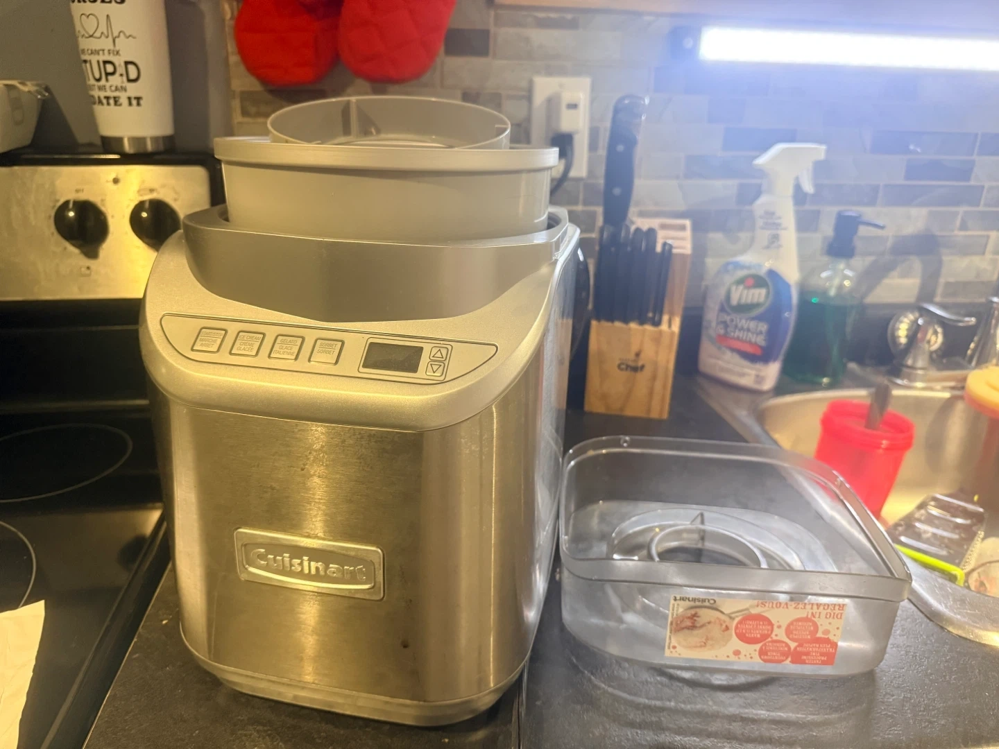 This Cuisinart ice cream, gelato, and sorbet maker is in good working order. It features a built-in compressor so no pre-freezing is needed. Comes with the instruction and recipe booklet.