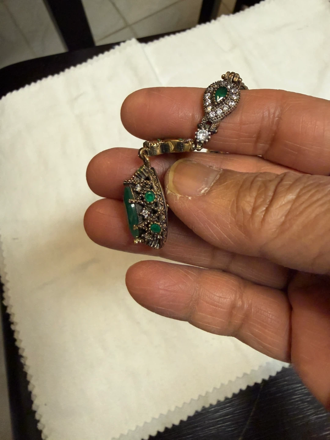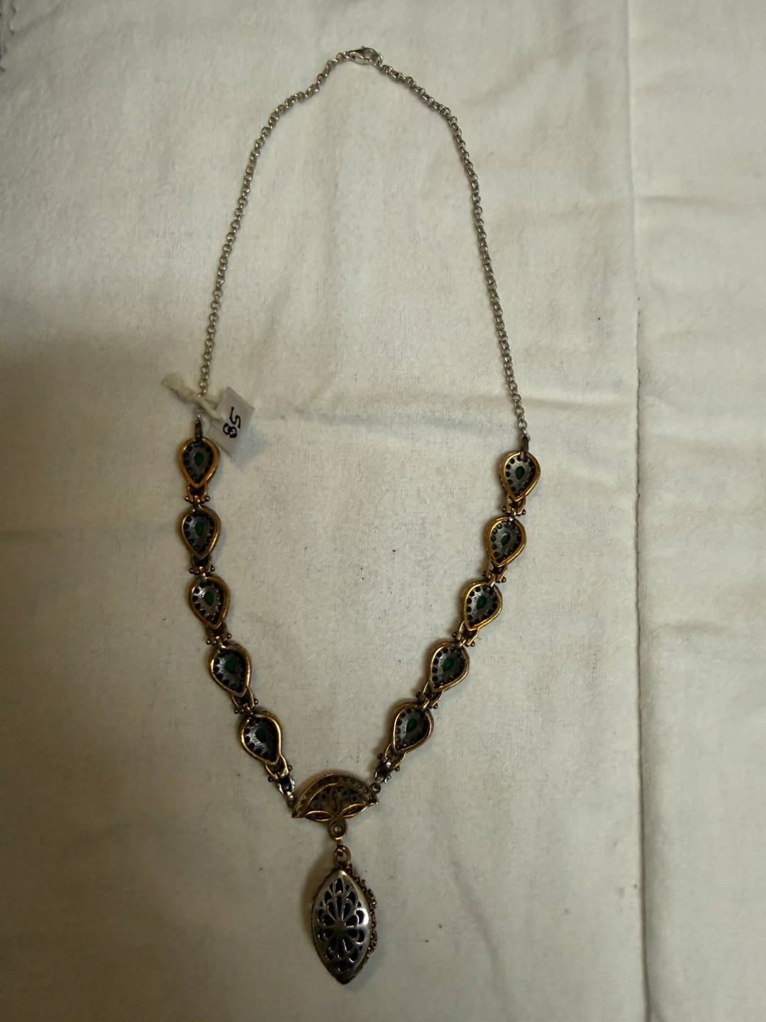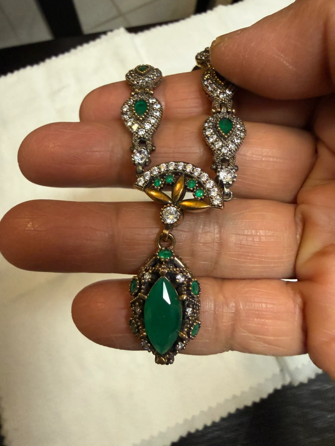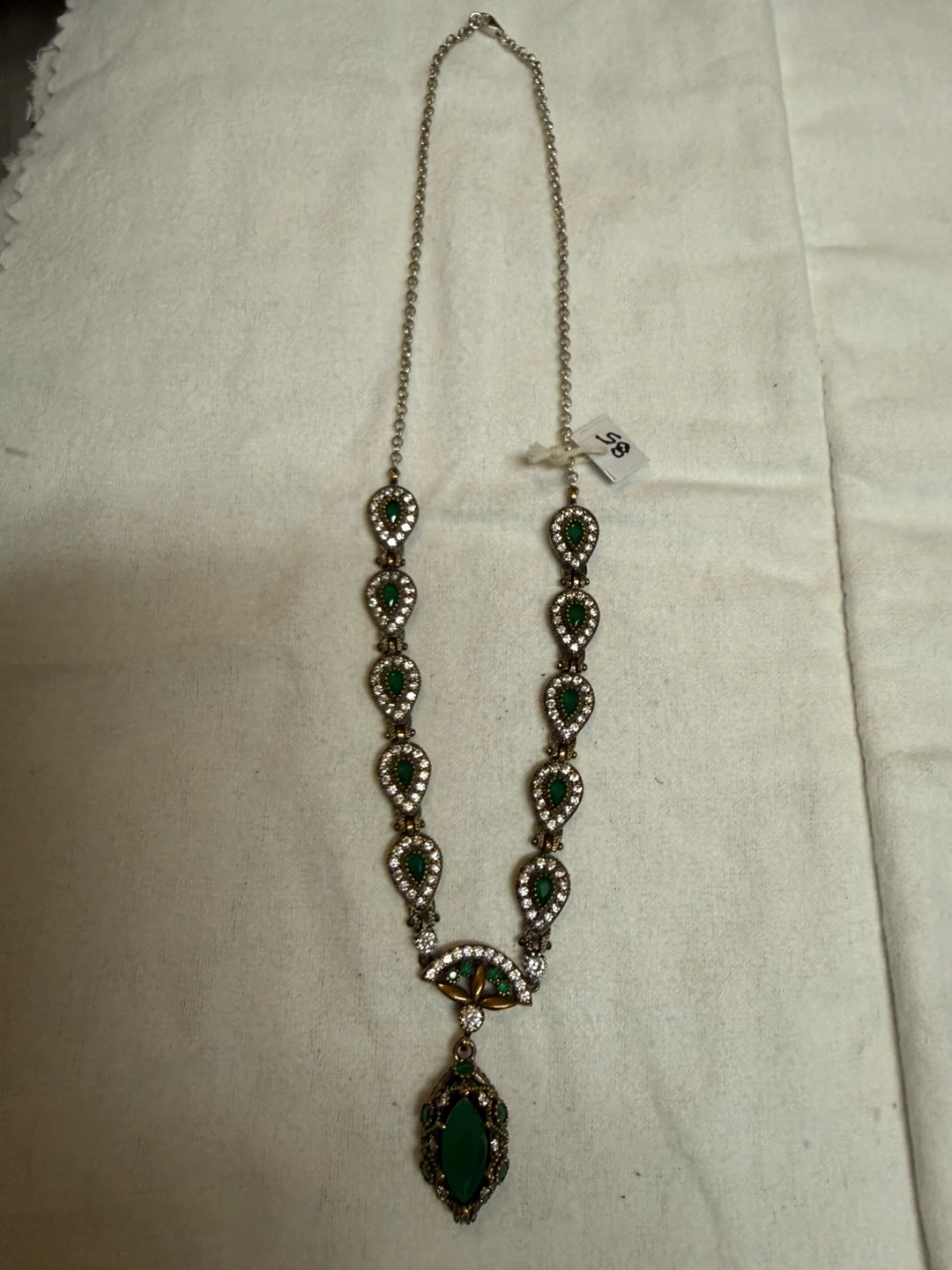 This elegant 18” necklace features a "925" sterling silver with copper chain and pendant. It's adorned with marquise-cut green gemstones and clear crystals. The intricate detailing on the pendant makes it a lovely statement piece.