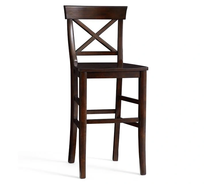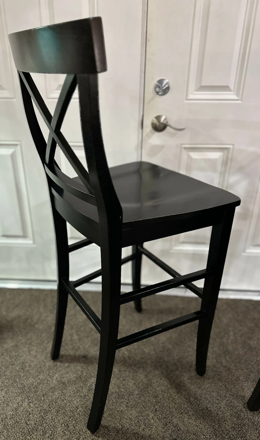 Two black wooden bar stools with a cross-back design. These stools are made of solid wood and are suitable for a kitchen island or bar area. They have a seat height of approximately 30 inches.
