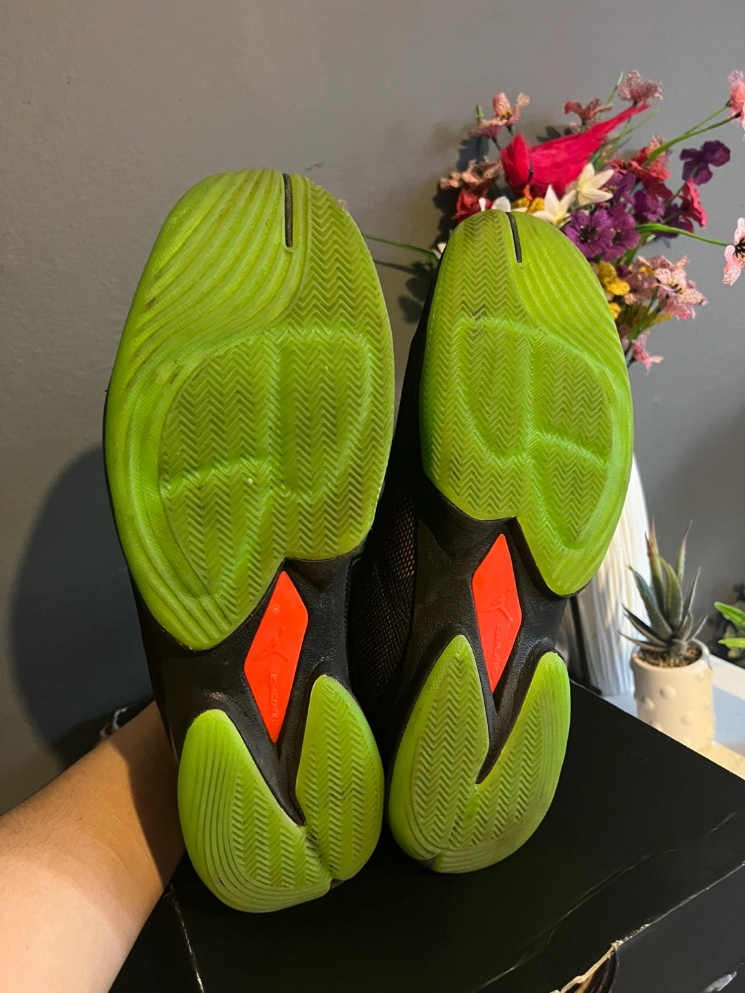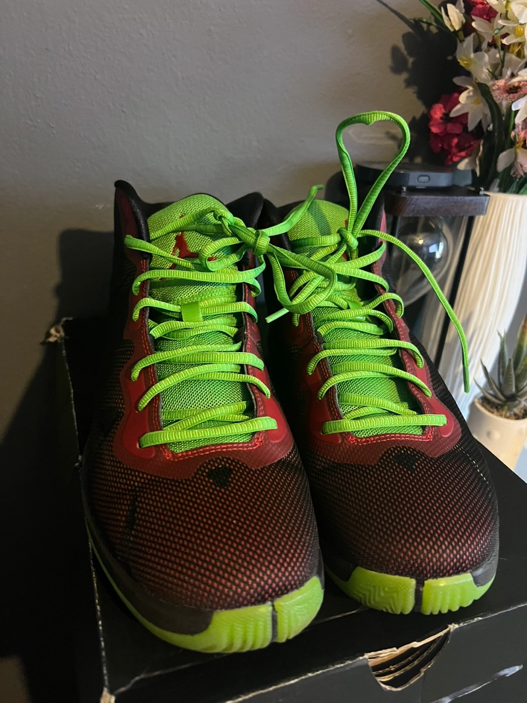 These Jordan Super.Fly 4 basketball shoes are black with bright green and red accents. They're a men's size 9.5. The original box is included.