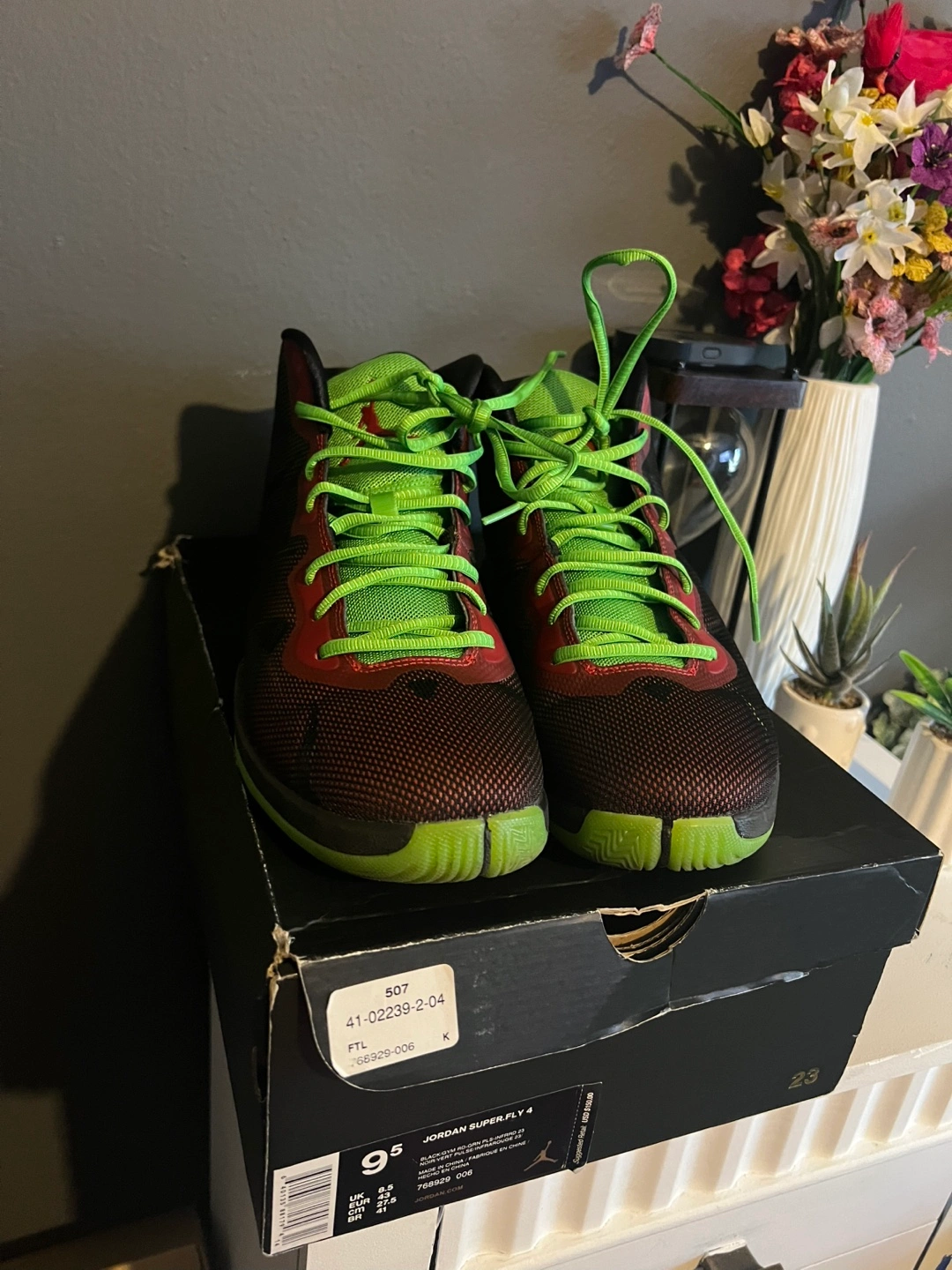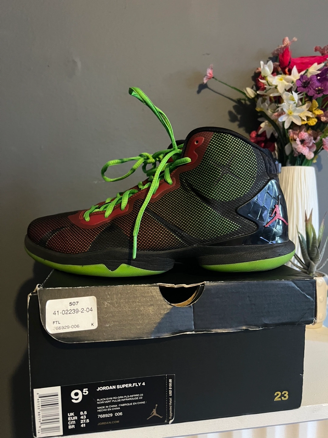 These Jordan Super.Fly 4 basketball shoes are black with bright green and red accents. They're a men's size 9.5. The original box is included.