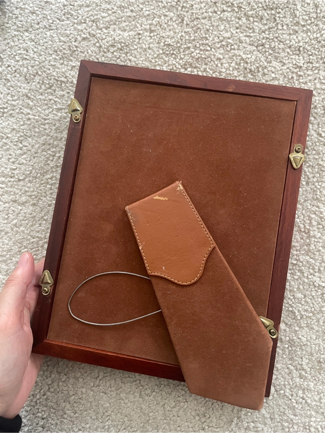 A classic wooden photo frame featuring a gold trim accent. It's designed for tabletop display with its attached stand. This frame is suitable for displaying cherished memories or artwork.