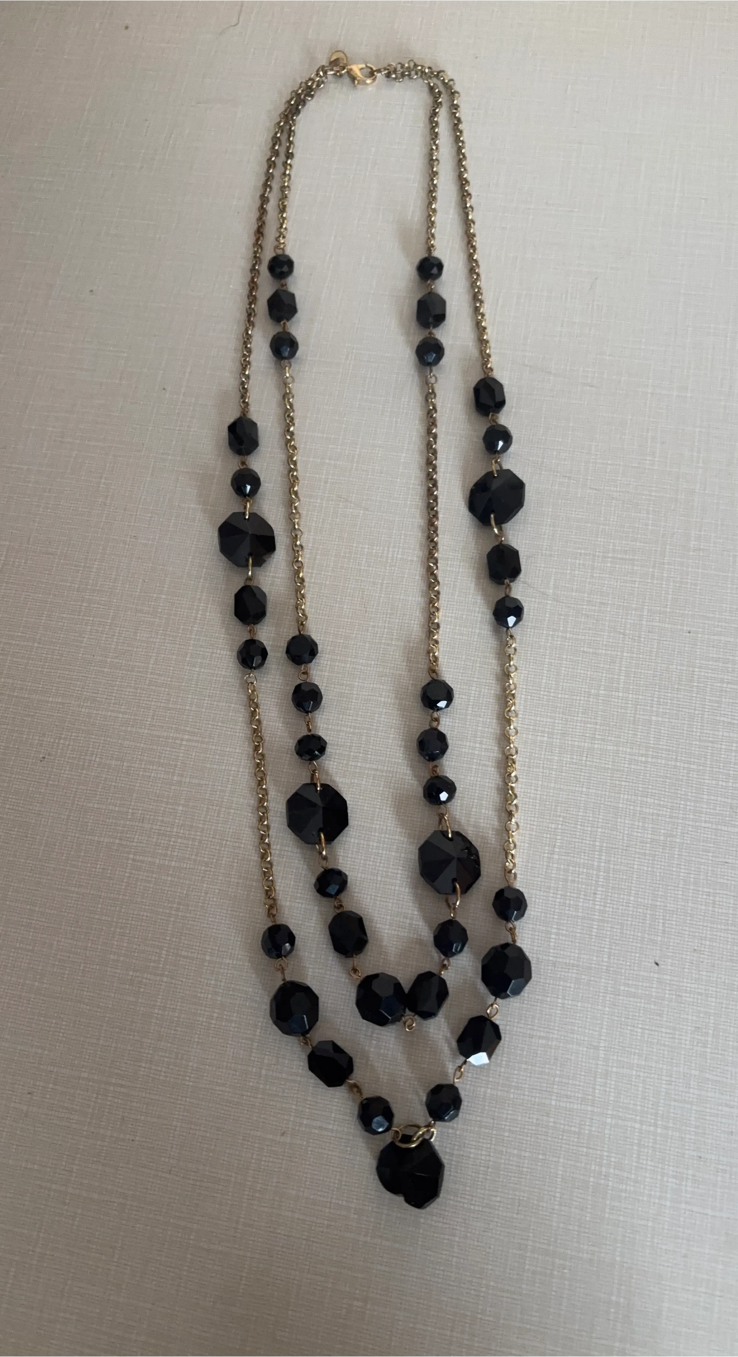A layered necklace with gold-tone chains and faceted black beads. It features various bead sizes for visual interest. This necklace would be a nice addition for dressing up an outfit.